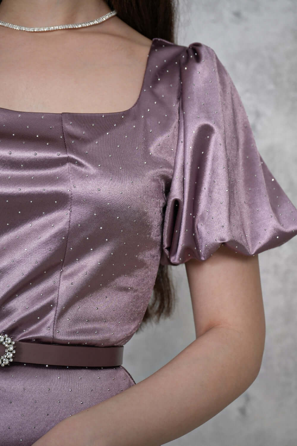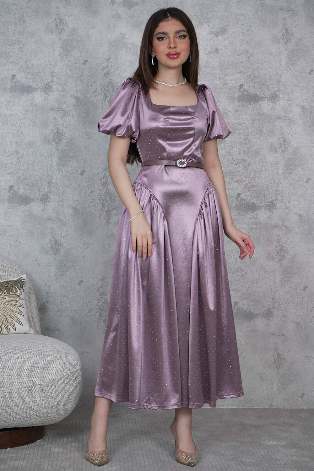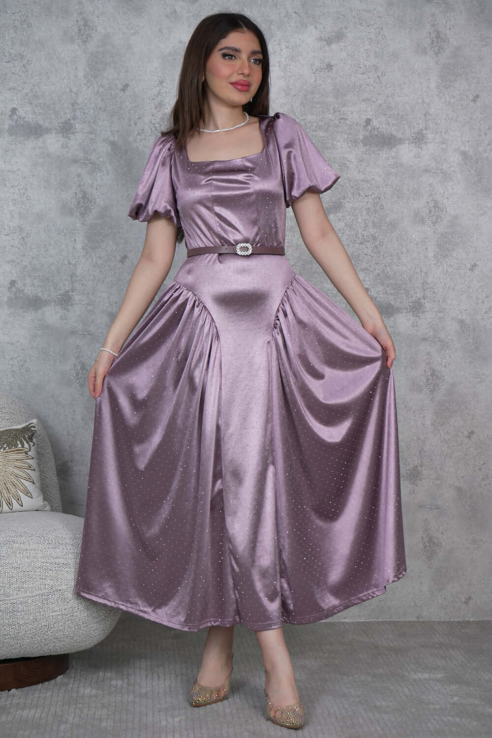 Design type Embellished maxi dress with ruffled puff sleeves Story type Embellished maxi dress with ruffled puff sleeves and belt The occasion Public outing or special occasions waist narrow collar square sleeves short stretching Expandable Material crepe satin Add-ons belt Care instructions Machine wash and iron with steam at low temperature (40%) and hang dry.