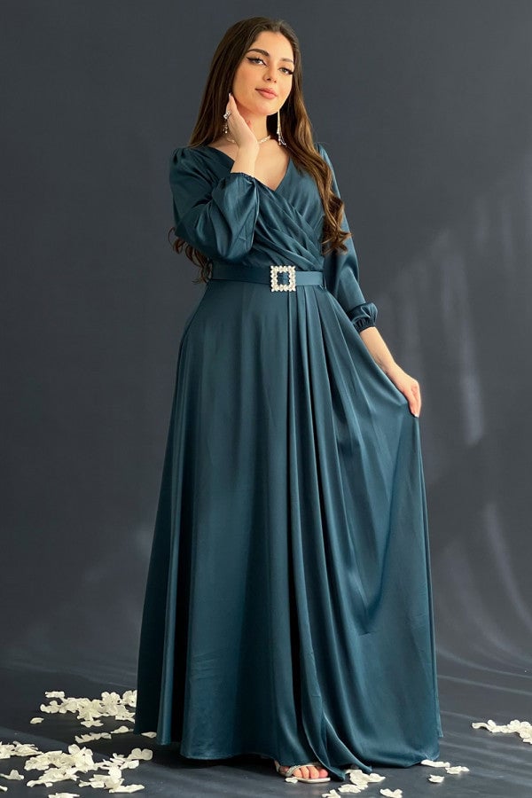 Material Silk satin with polyester Design type Classic dress with a belt at the waist Story type Long, cut, with a cinched waist, a V-neck, a draped chest, long sleeves, a cinched waist, and a belt with a crystal brooch. occasion Night out waist Zam Klosh collar V-neck sleeves Long stretching Non-stretchable Add-ons Crystal brooch belt Care instructions Washable and ironable at low temperature