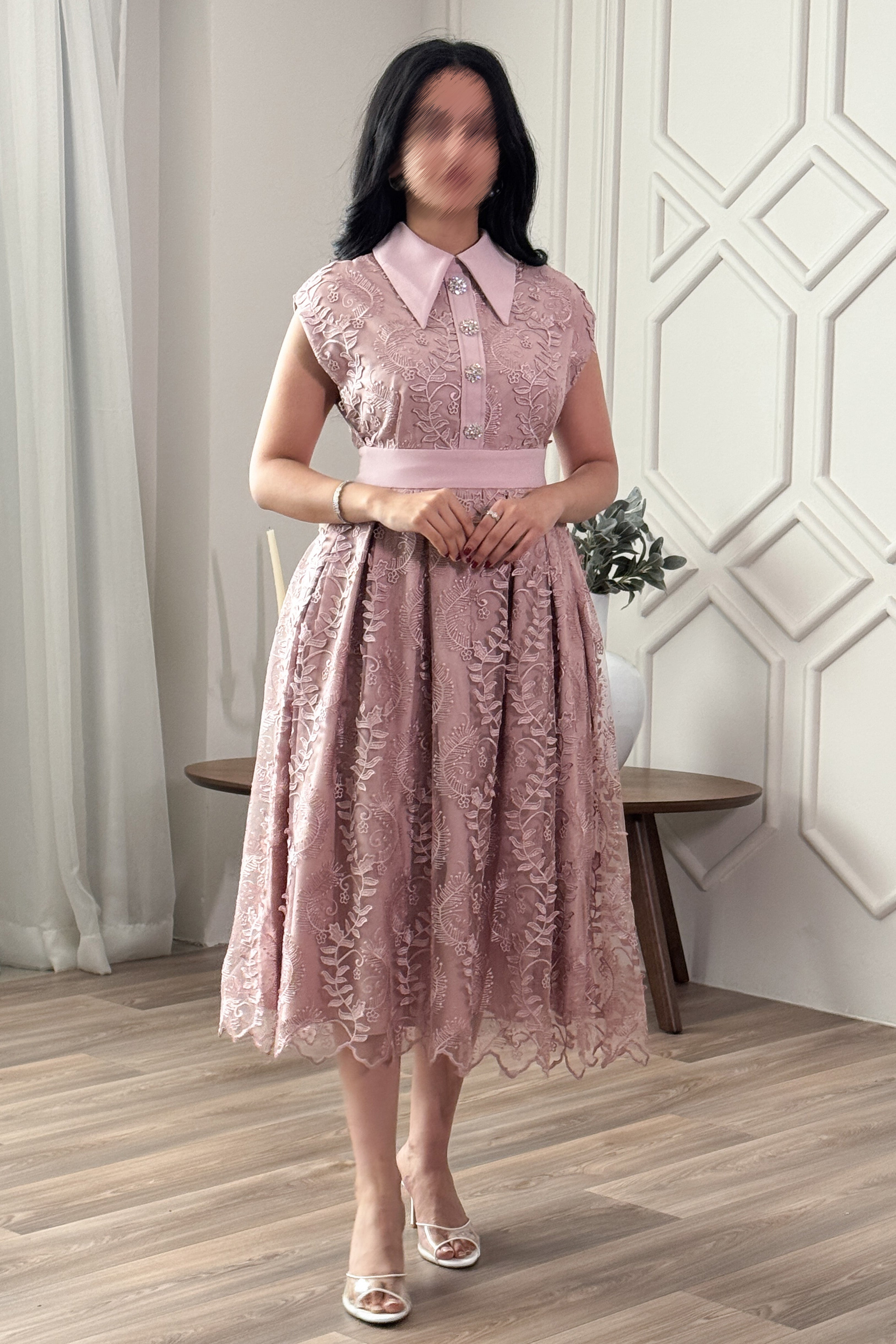 Design type Classic midi lace dress Story type Classic lace midi dress with crystal buttons The occasion Public outing or special occasions waist narrow collar Folded sleeves Cape stretching Non-stretchable Material lace Care instructions Machine wash and iron with steam at low temperature (40%) and hang dry.
