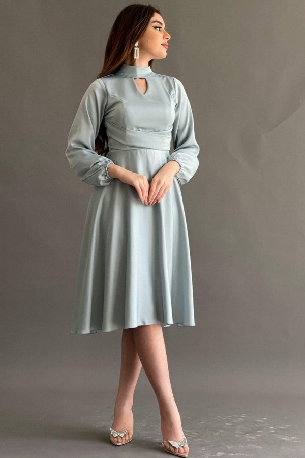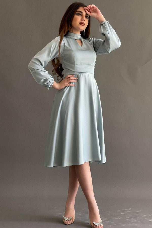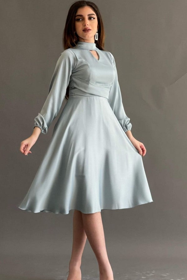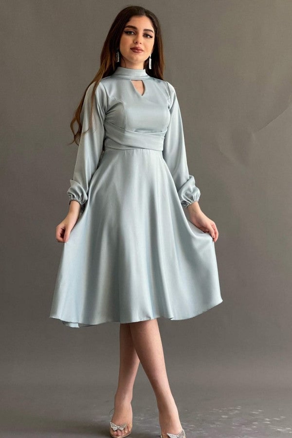 : فستان قصير كلوش بياقة مرتفعة وأكمام طويلة واسعة