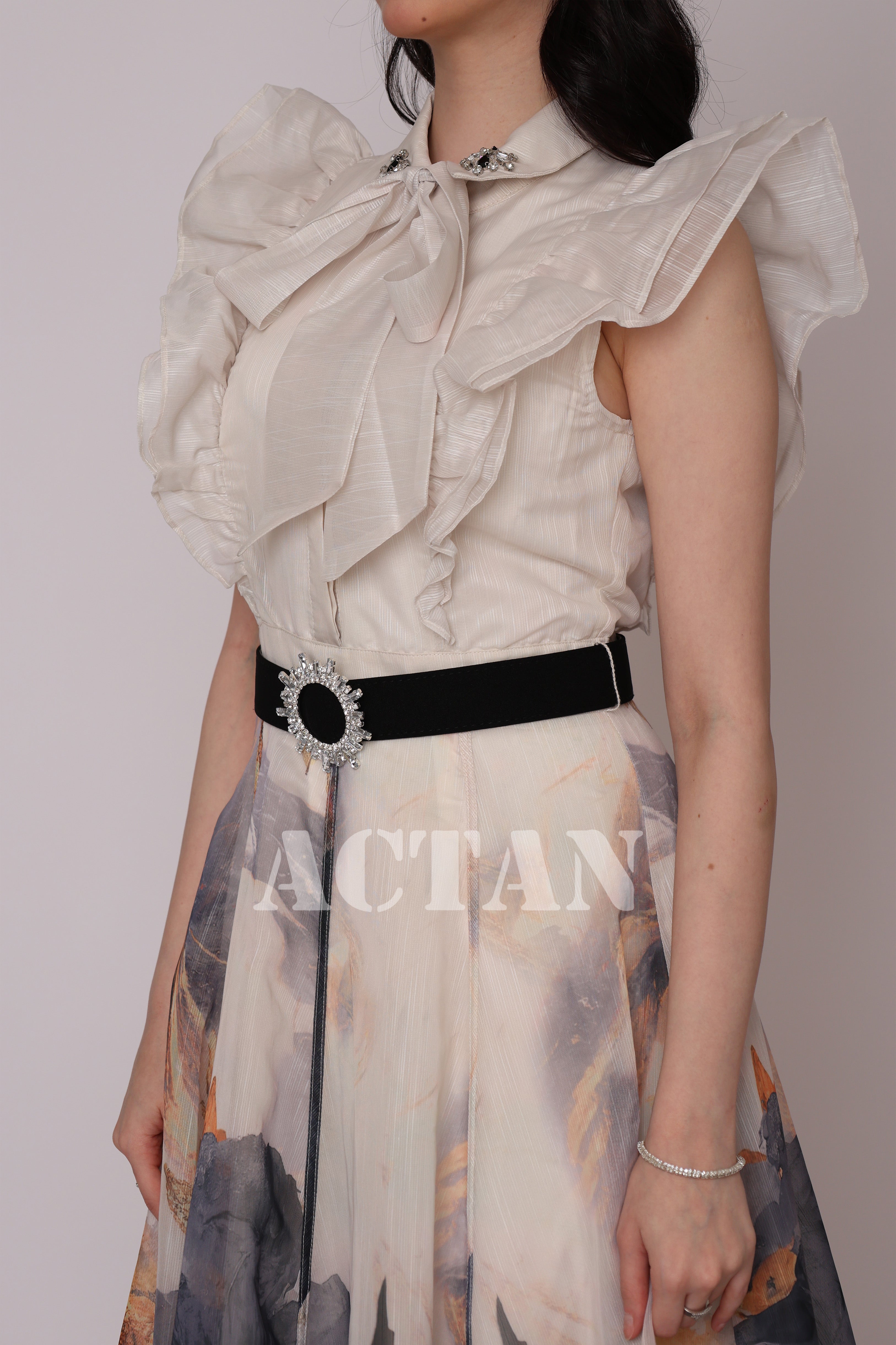 Design type Elegant midi dress with floral print Story type Elegant floral print midi dress with a pleated collar, embellished with crystals, and a belt at the waist. The occasion Public outing or special occasions waist narrow collar Folded sleeves short stretching Non-stretchable Material Organza Add-ons belt Care instructions Machine wash and iron with steam at low temperature (40%) and hang dry.