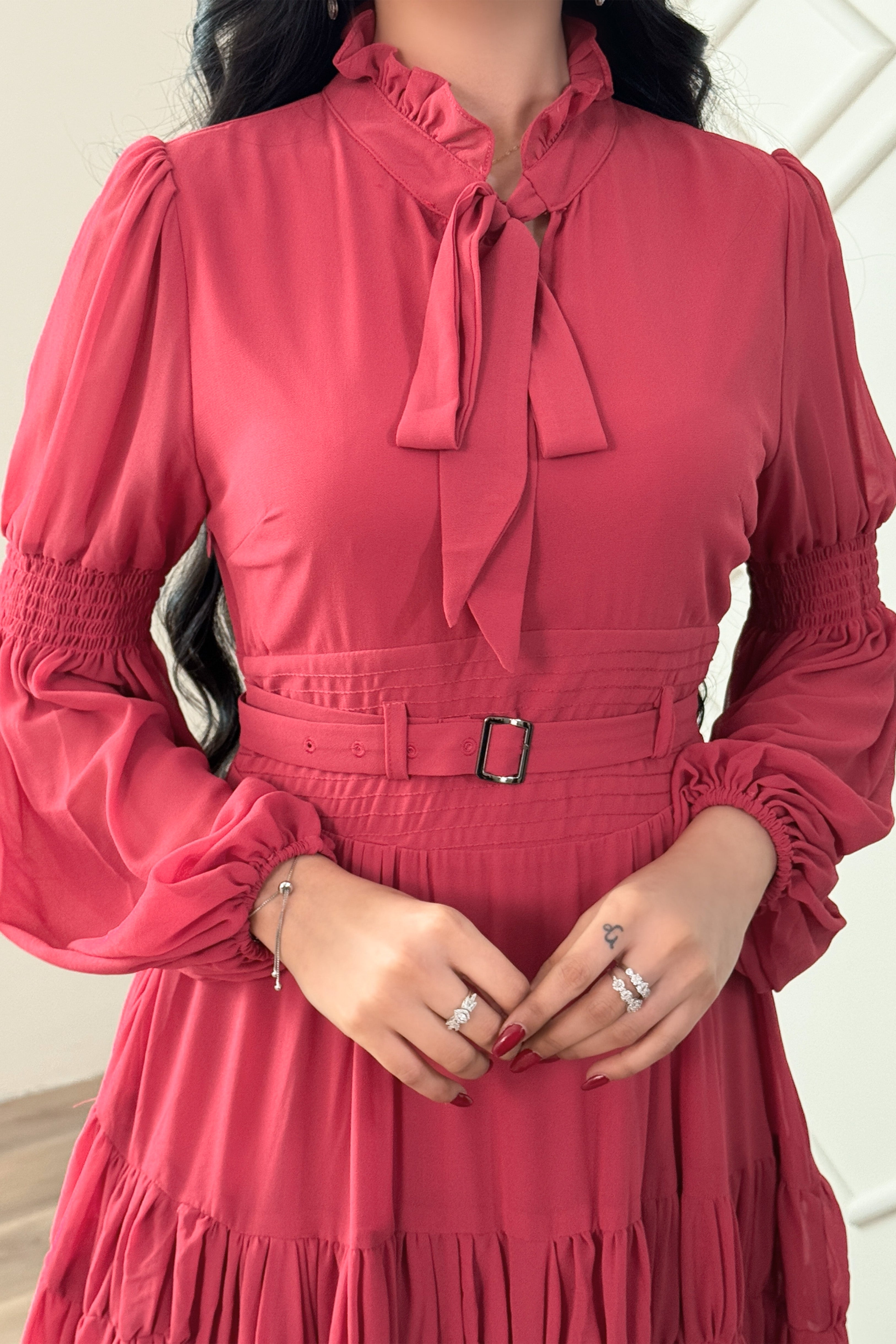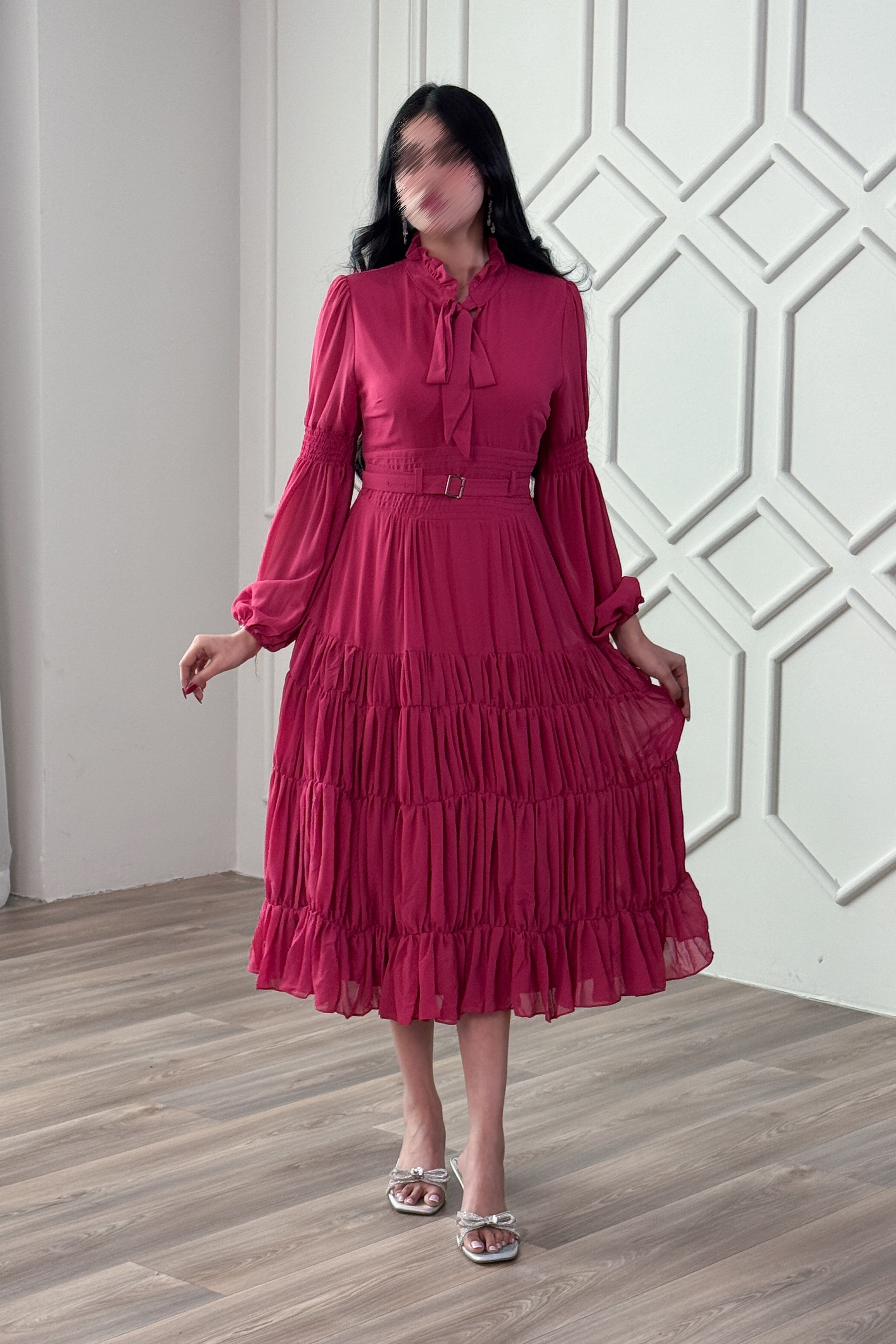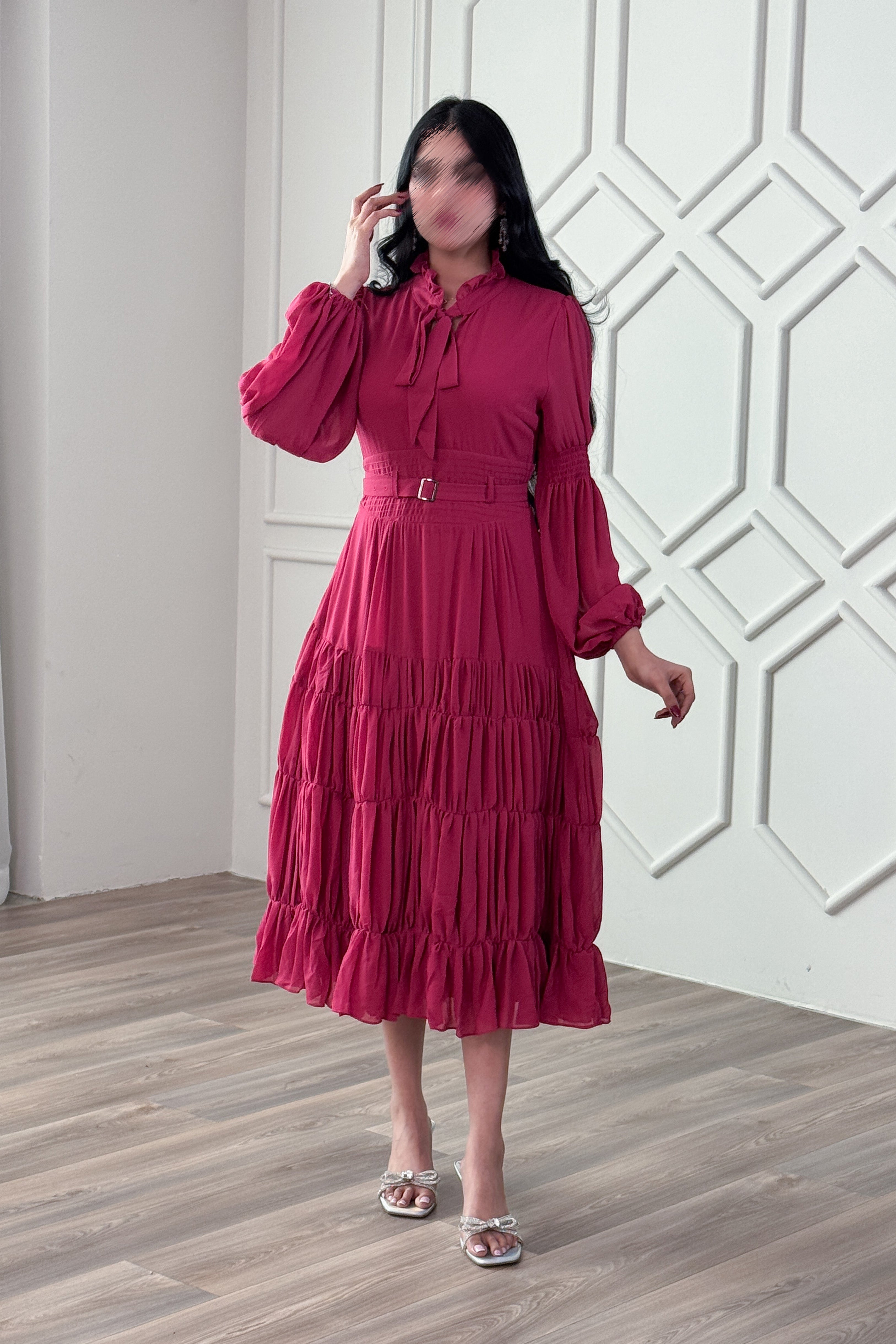 Fuchsia Tiered Midi Dress with Belt at Waist