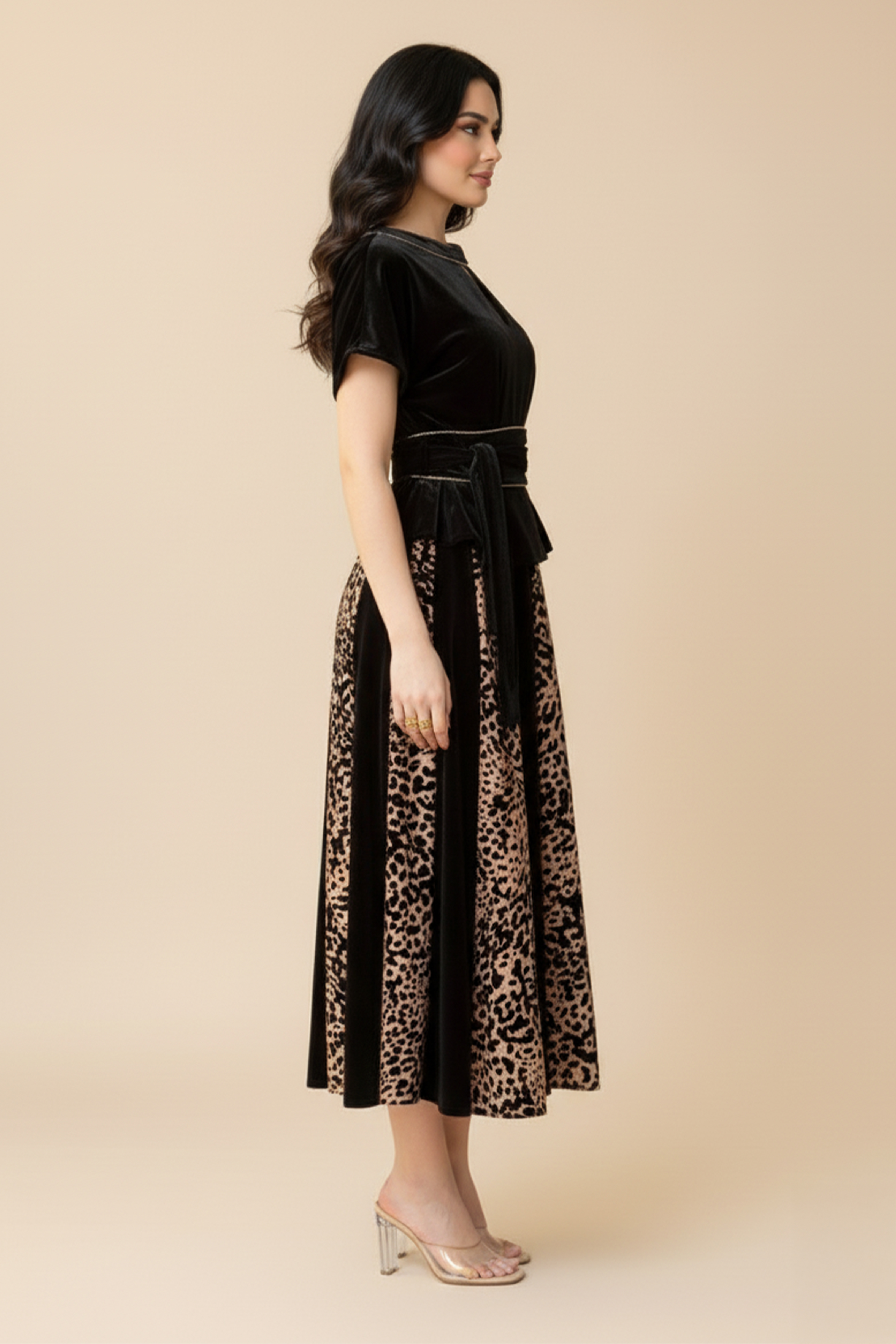 Design type Leopard print velvet midi dress with wrap belt Story type Leopard print velvet midi dress with wrap belt and neckline The occasion Public outing or special occasions waist narrow collar Circular sleeves short stretching Expandable Material velvet Add-ons belt Care instructions Wash and steam iron at low temperature 40 percent and hang dry