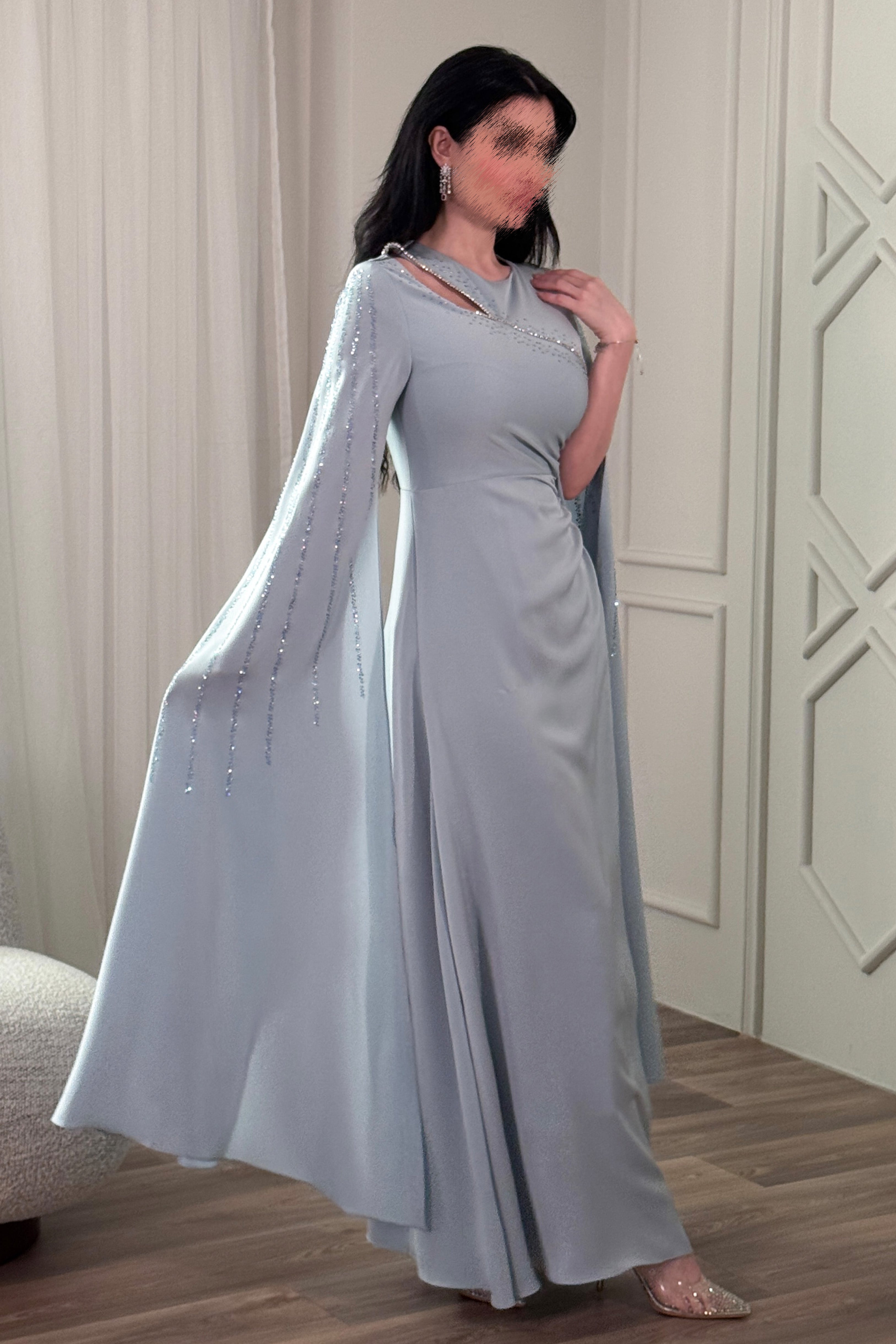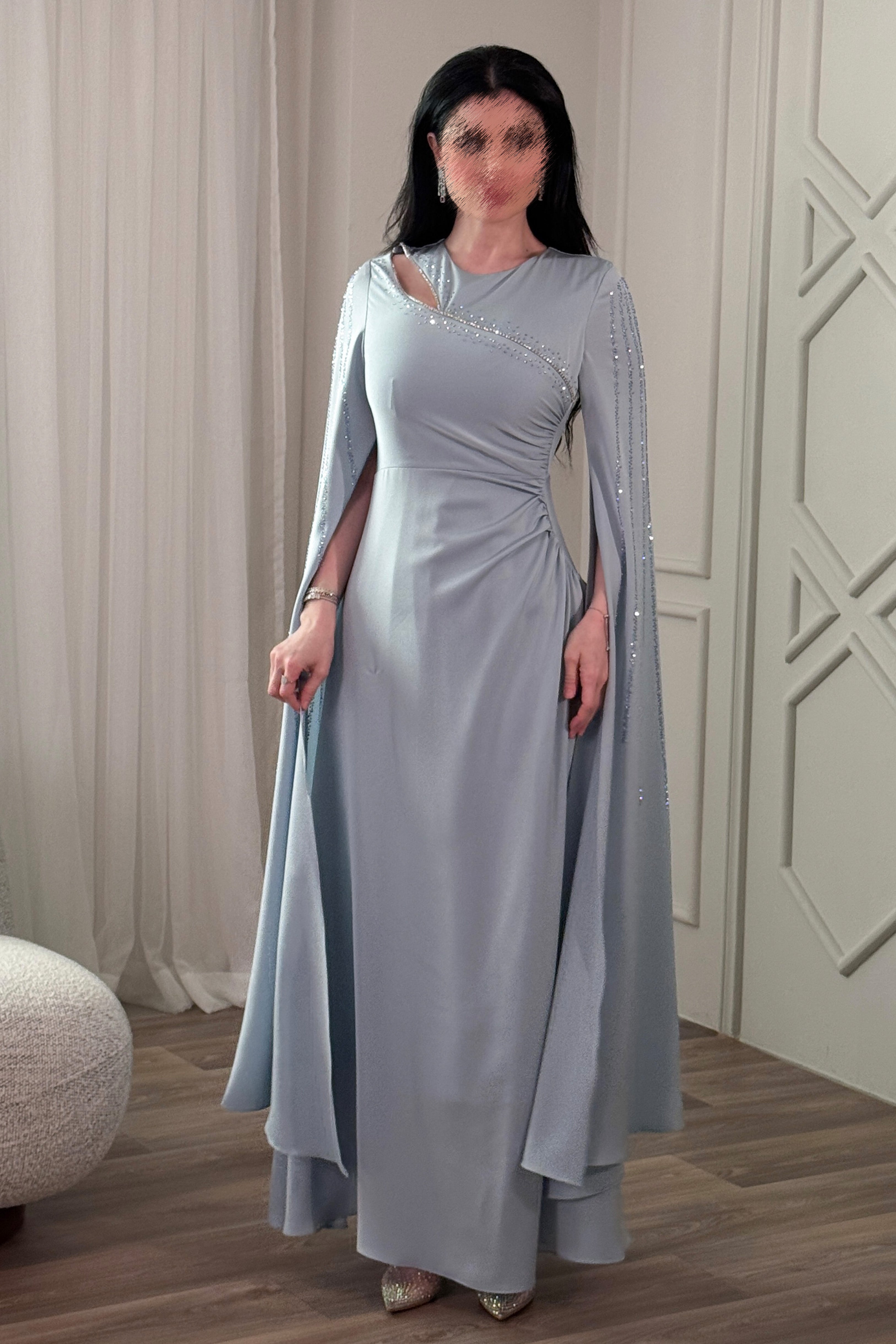 Design type Maxi cape dress with slit at the chest Story type Draped cape maxi dress with ruffled neckline The occasion Public outing or special occasions waist narrow collar Circular sleeves Cape stretching Non-stretchable Material crepe Care instructions Wash and steam iron at low temperature 40 percent and hang dry
