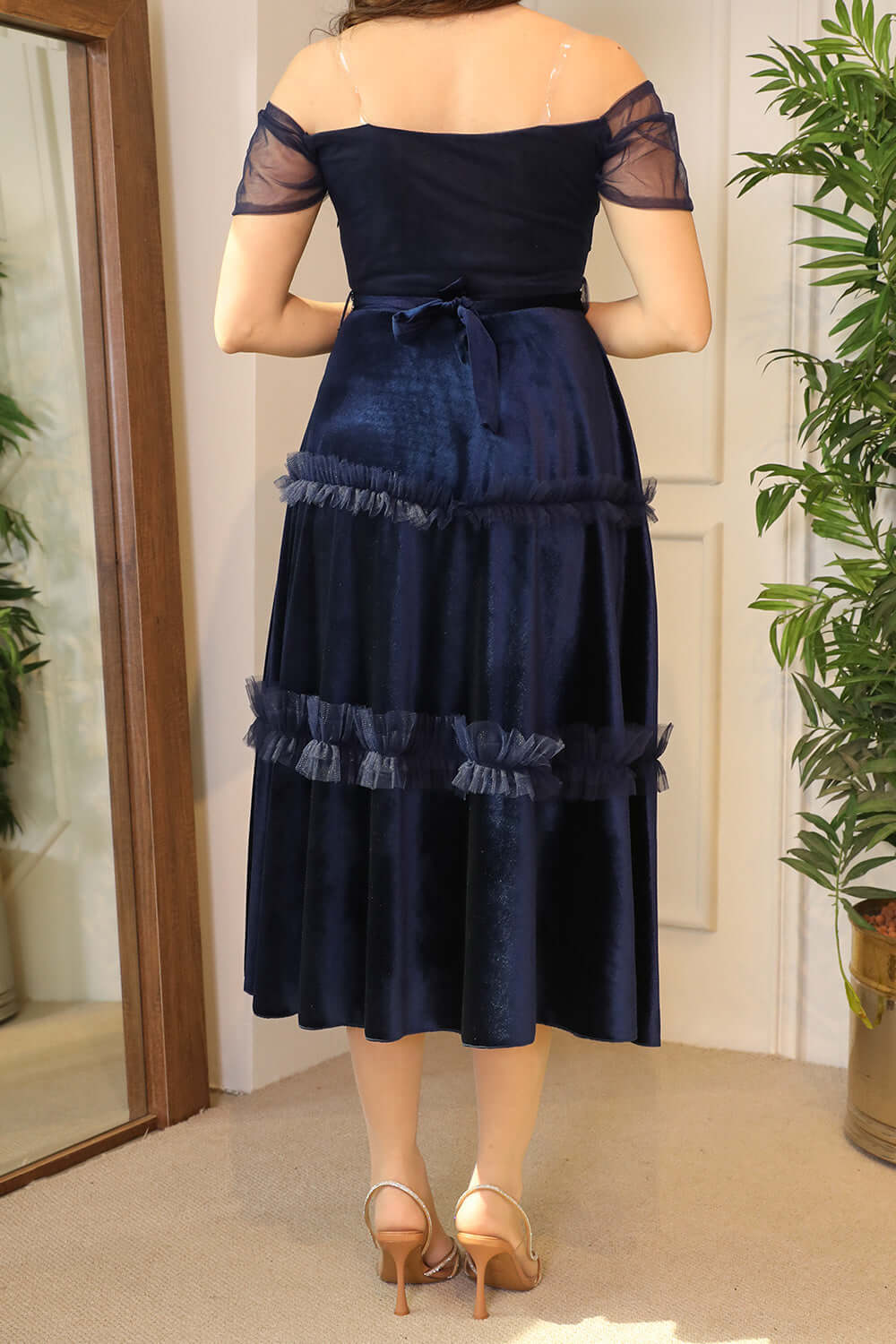 : فستان ميدي مخمل بطبقات كشكش مع حزام على الخصر وياقة أوف شولدر