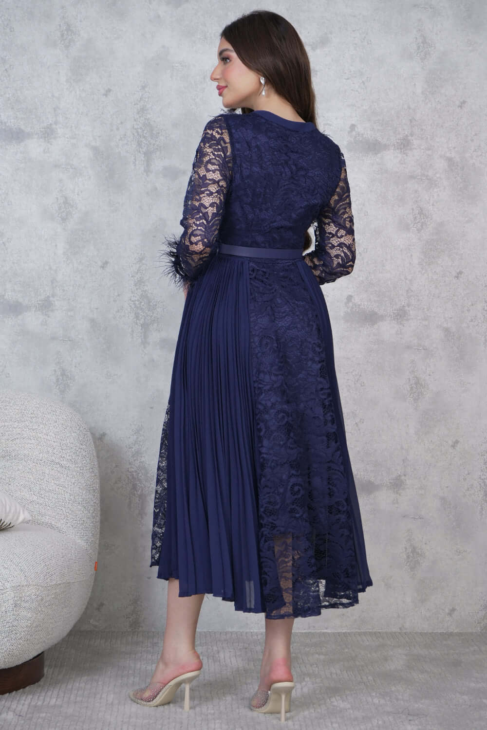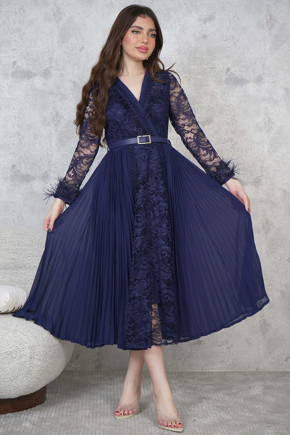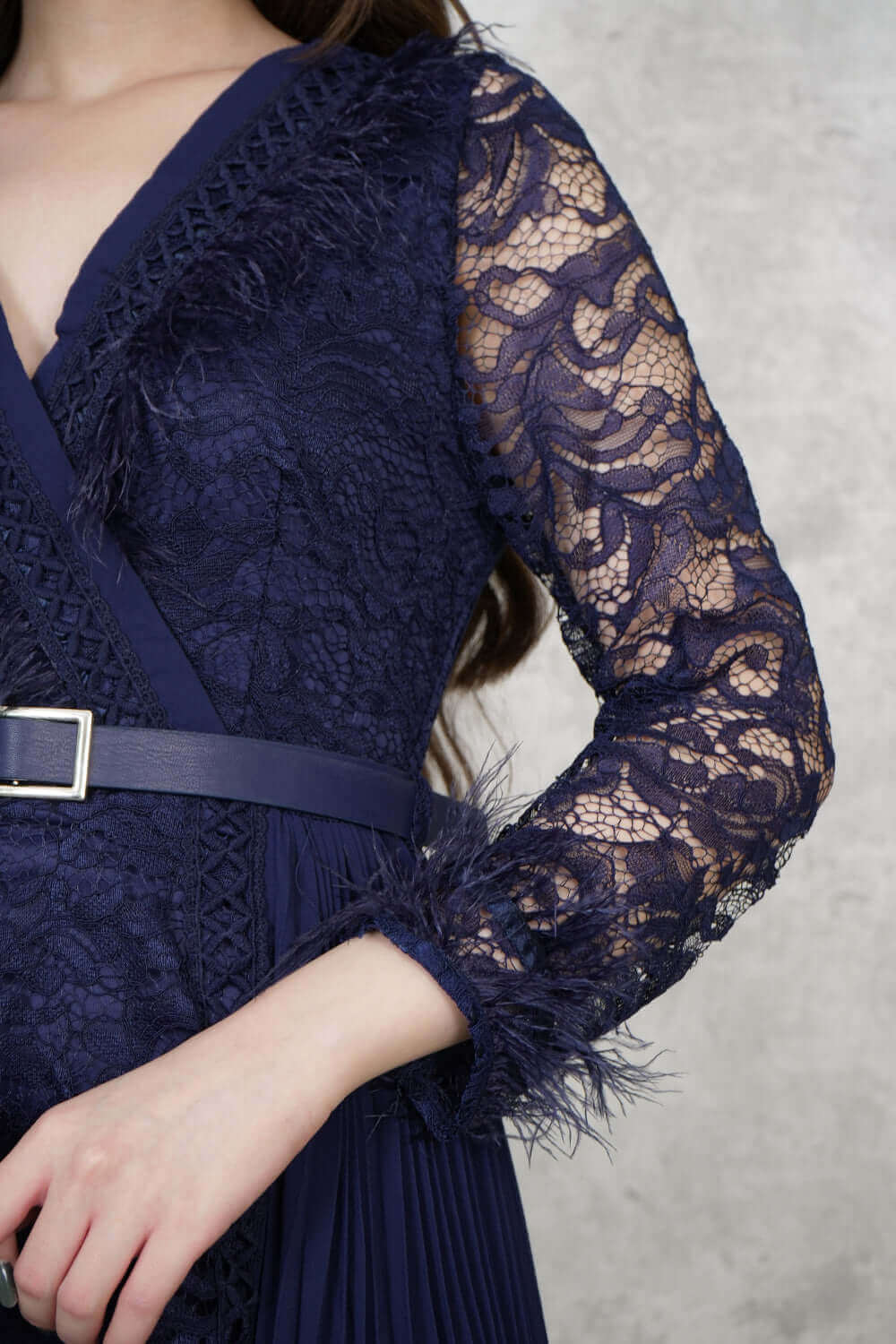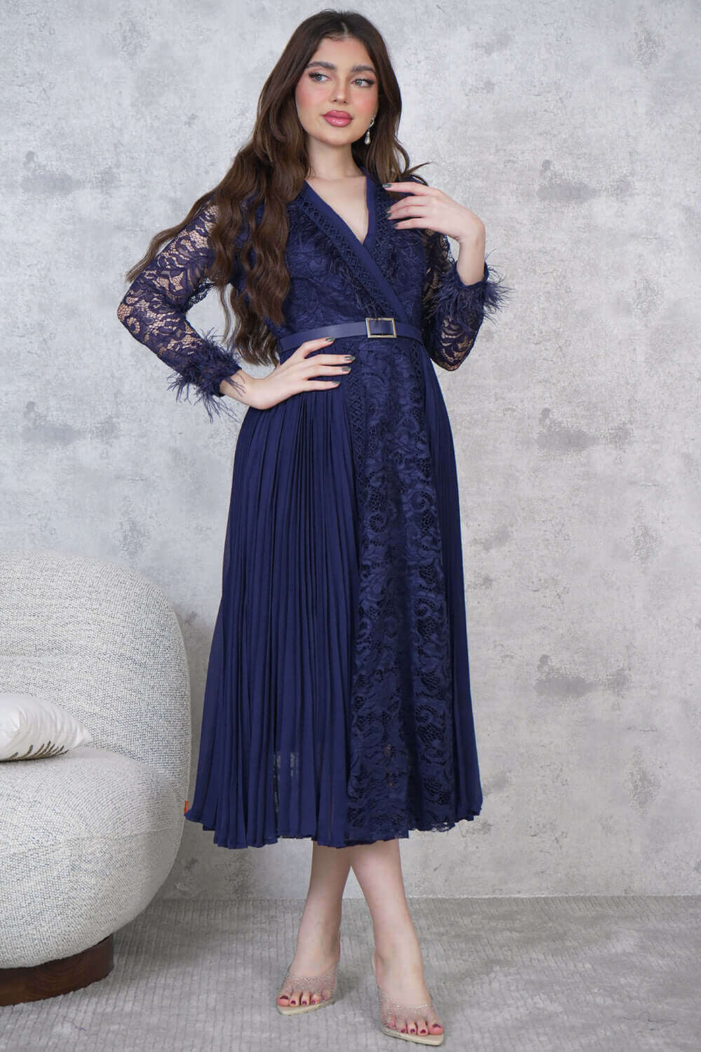 Design type Feathered midi dress Story type Chiffon lace midi dress with belt at waist and long sleeves with a v-neck decorated with feathers The occasion Public outing or special occasions waist narrow collar v sleeves long stretching Non-stretchable Material chiffon lace Add-ons belt Care instructions Machine wash and iron with steam at low temperature (40%) and hang dry.