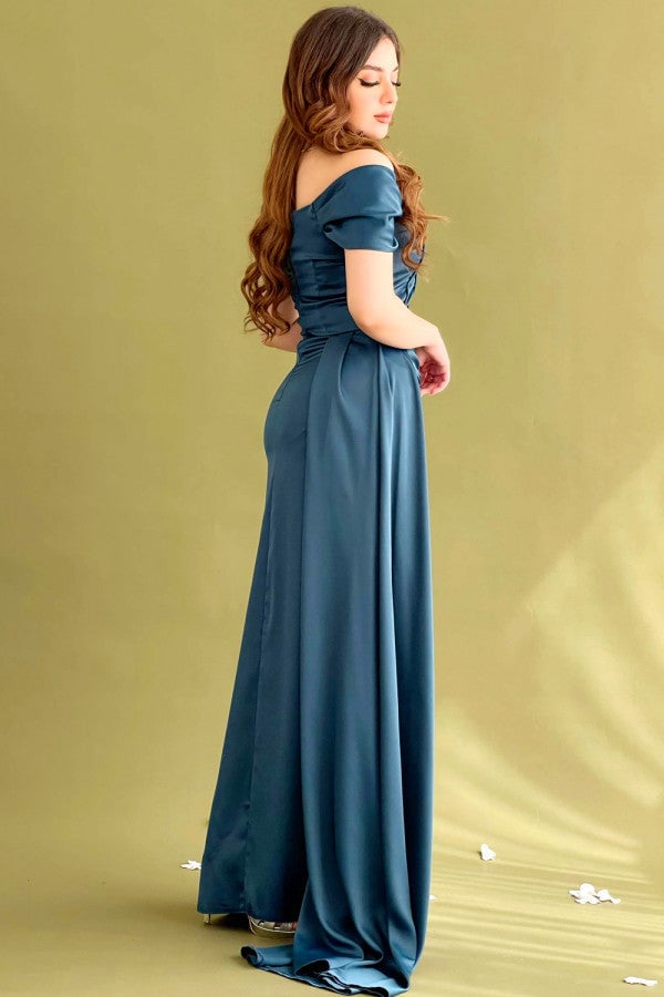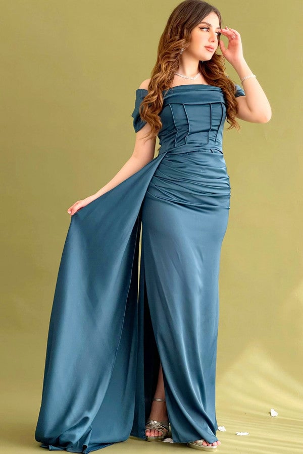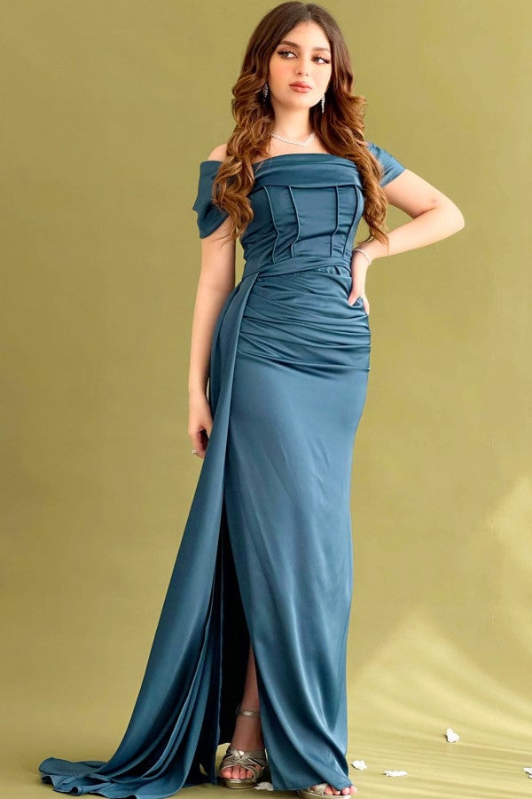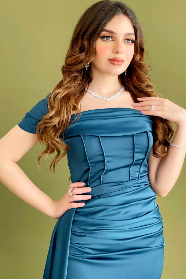 طويل بخصر ضيق وياقة أوف شولدر، أكمام قصيرة، مع ذيل جانبي