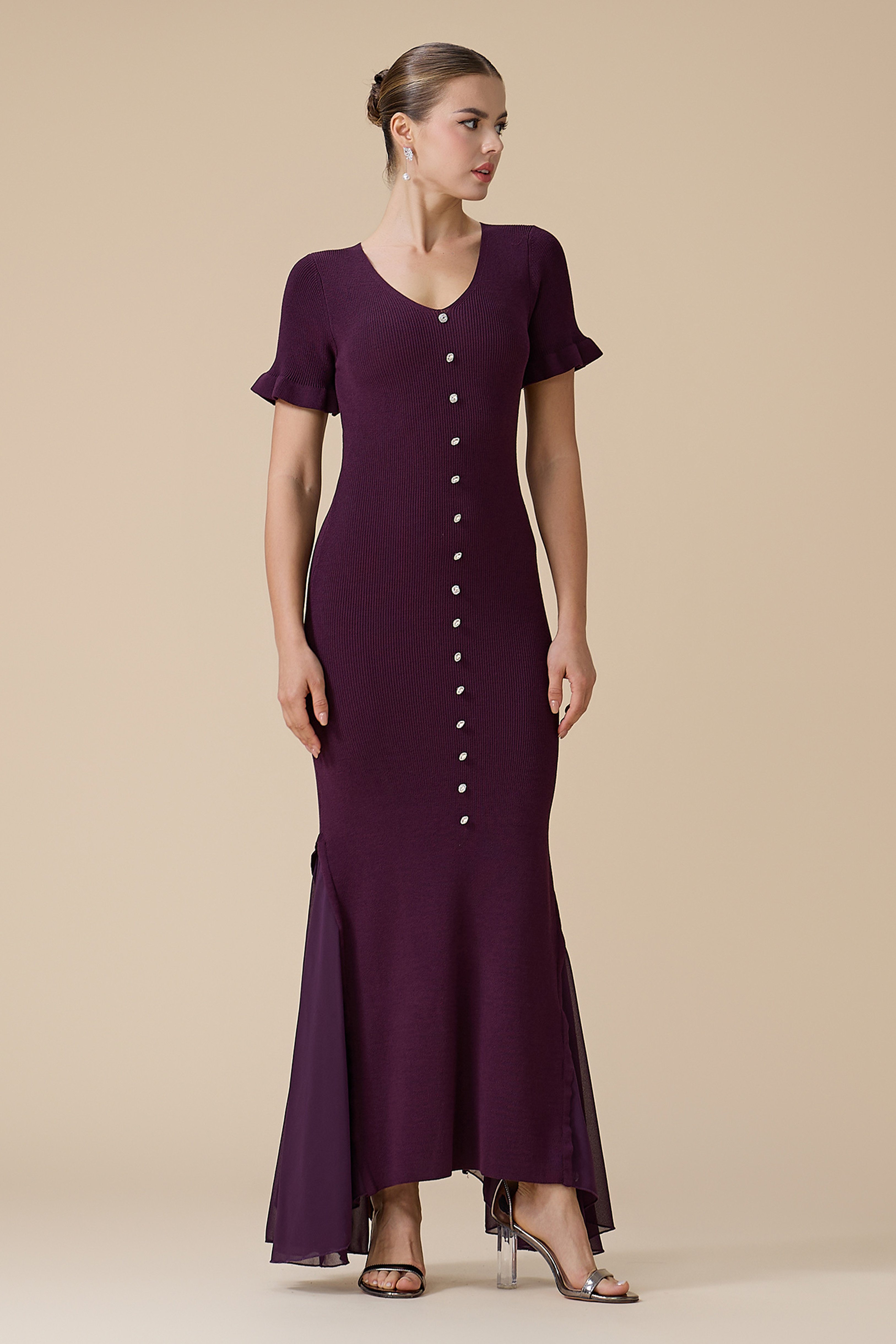 - نوع القصة: فستان عنابي طويل محبوك مزين بأزرار كريستالية، بأكمام قصيرة مع كرانيش وبياقة مستديرة