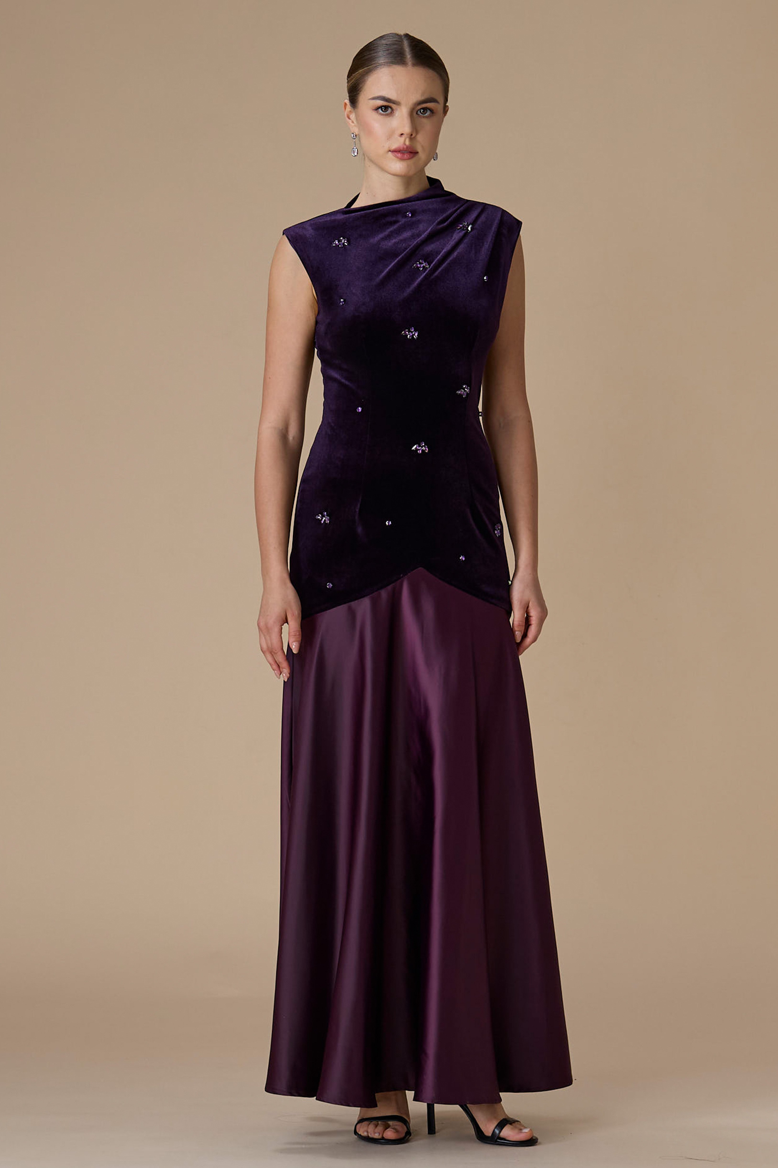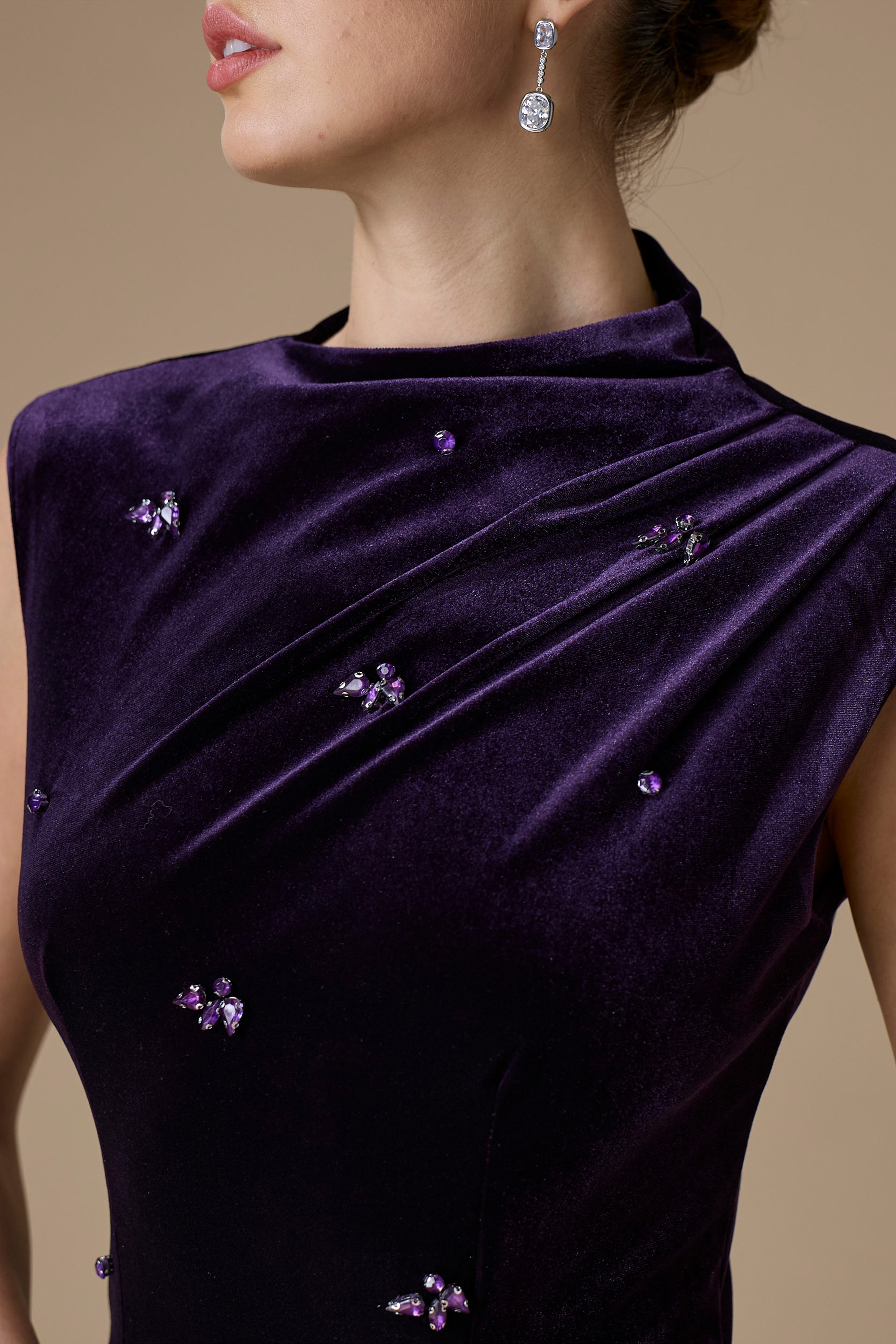فستان موف طويل بقصة مائلة بياقة مرتفعة درابيه ومزين بالكريستالات