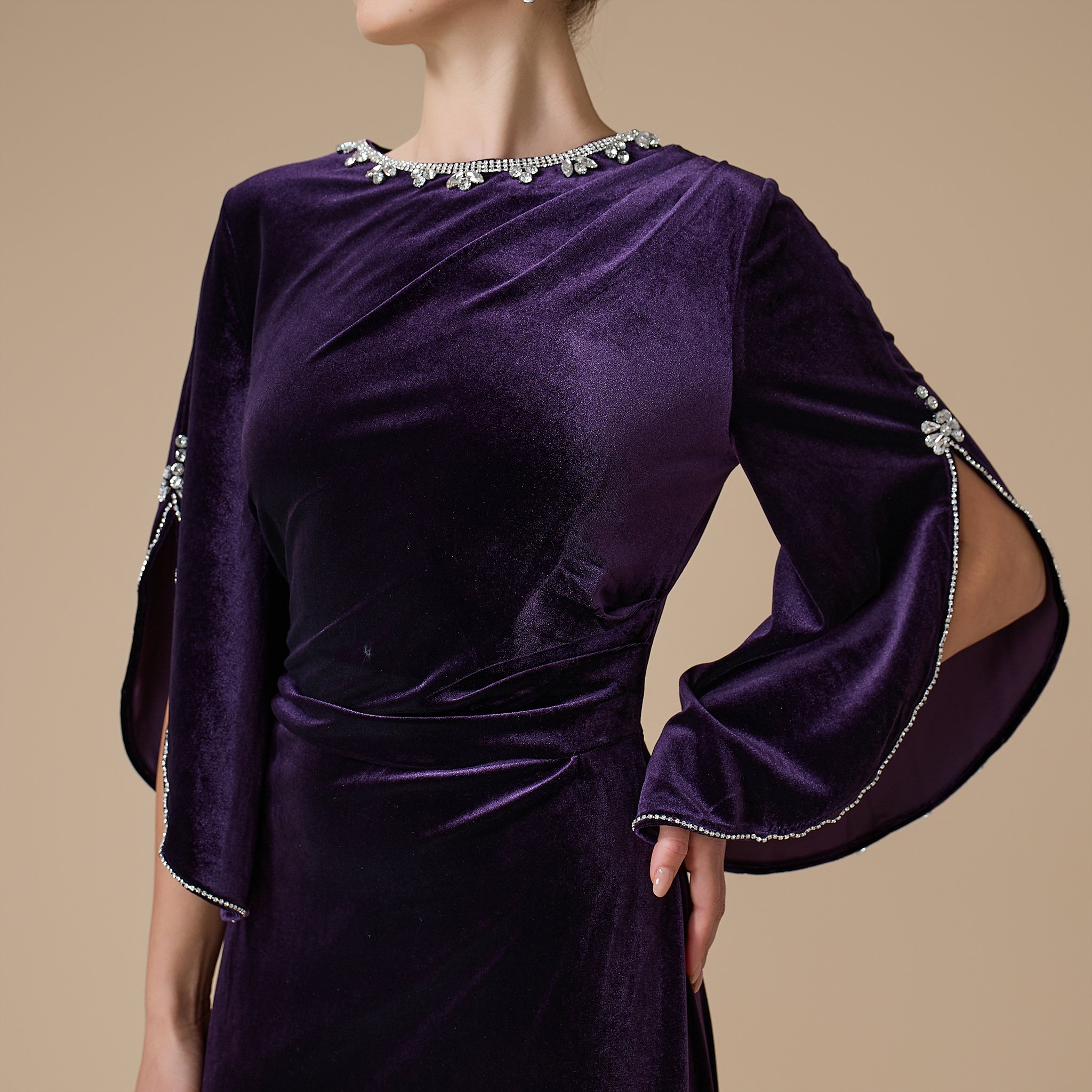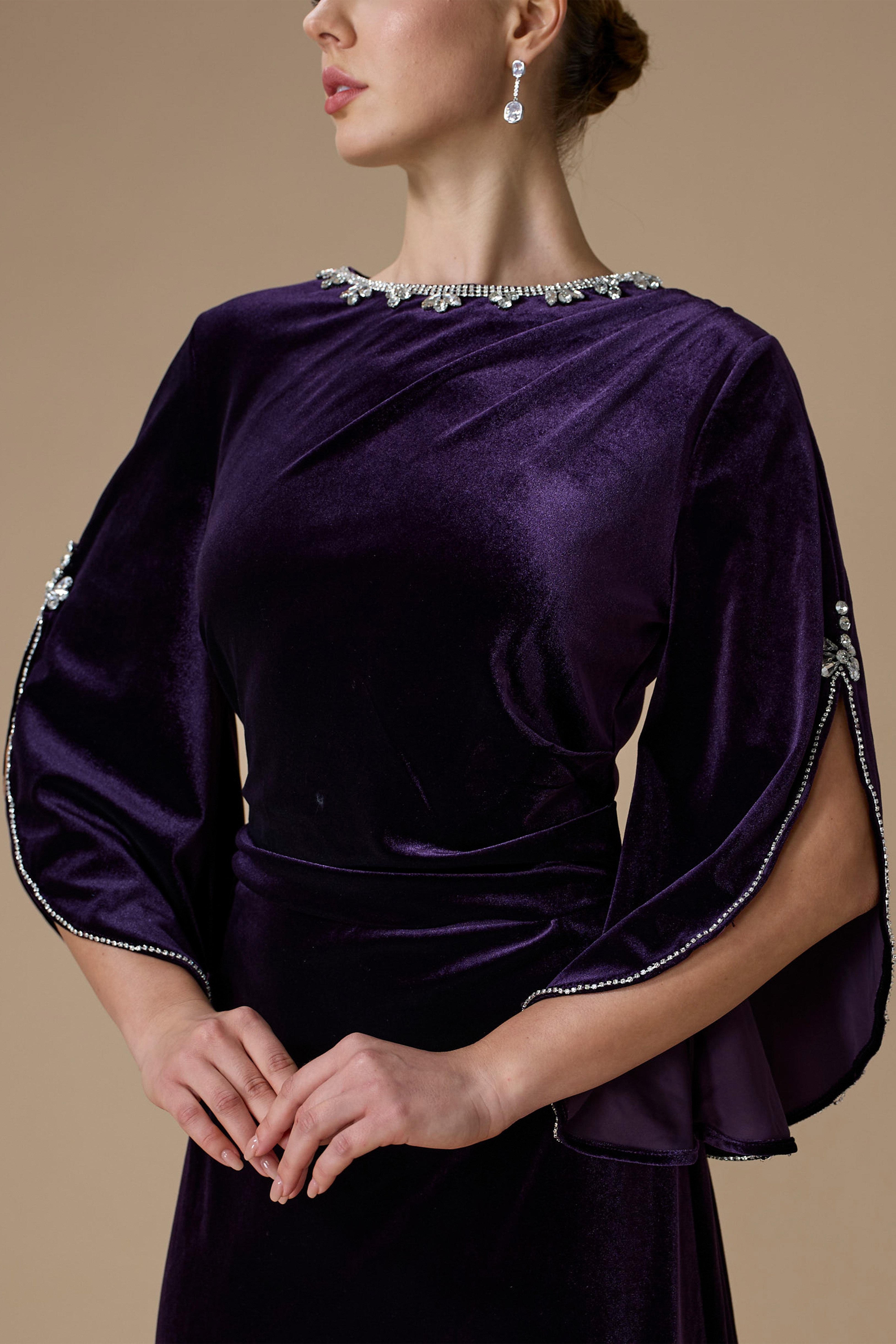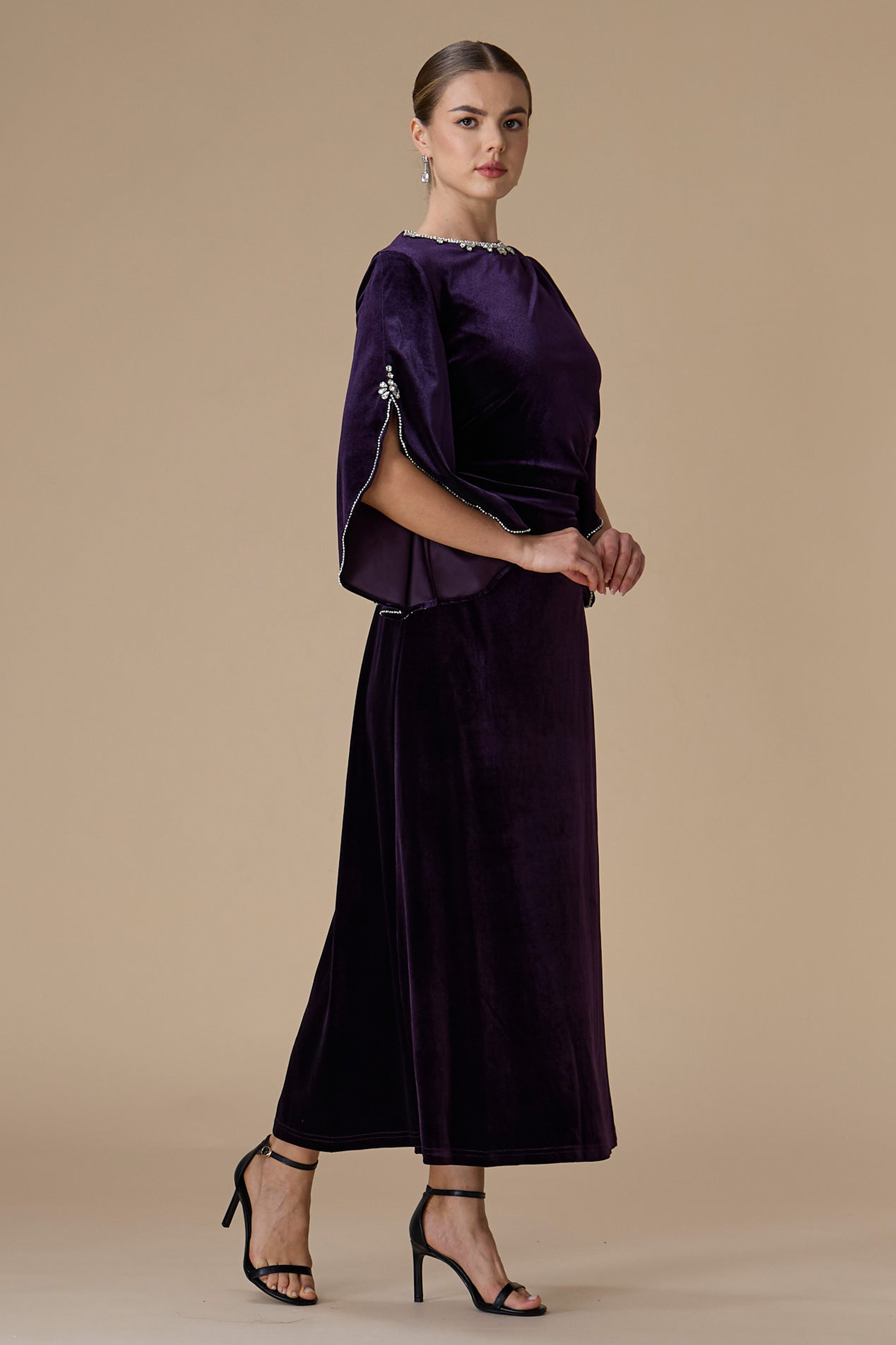 فستان بنفسجي طويل مزين بالكريستالات بياقة دائرية مغلقة وأكمام طويلة بتصميم كاب واسع ومفتوح