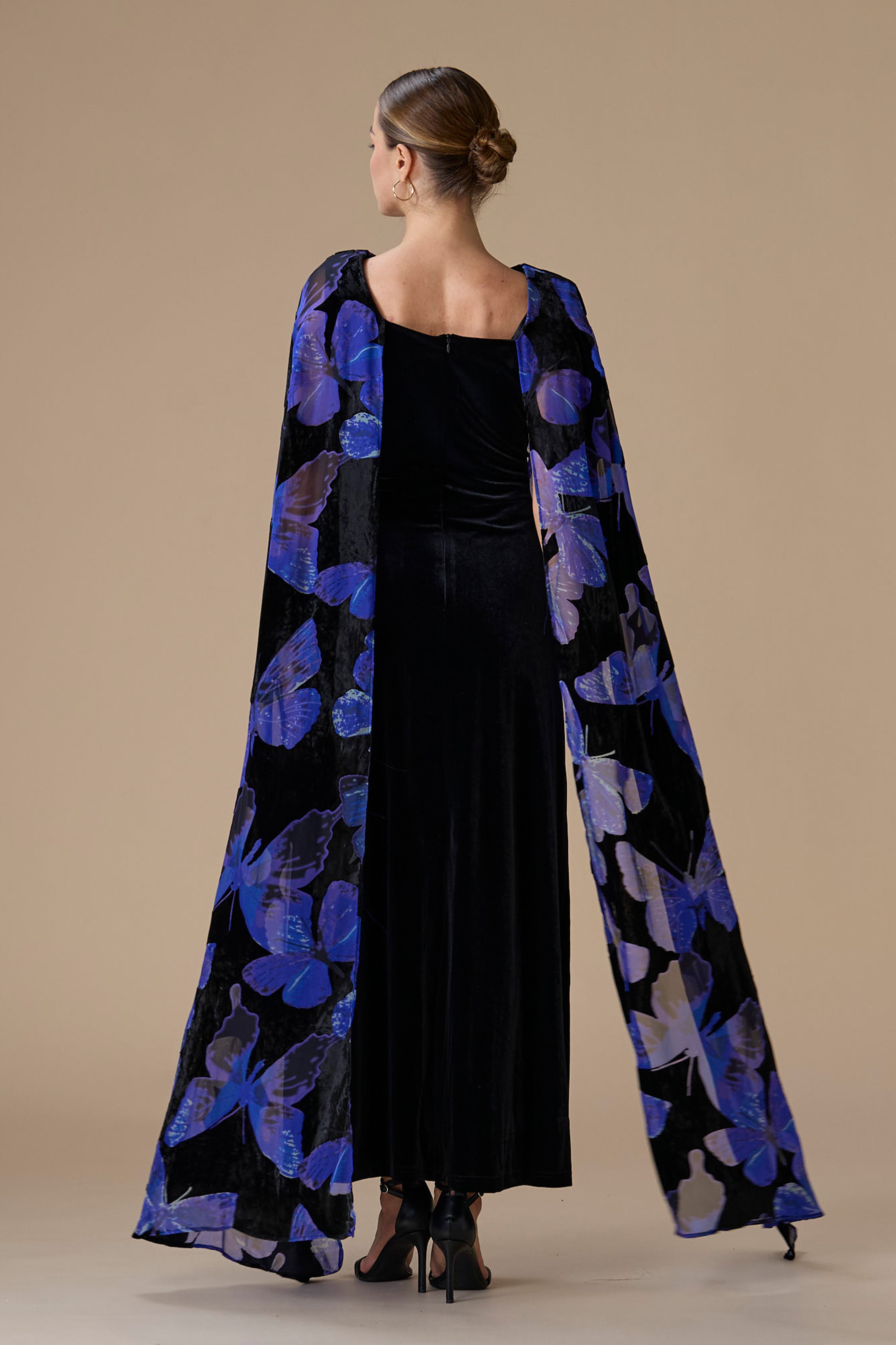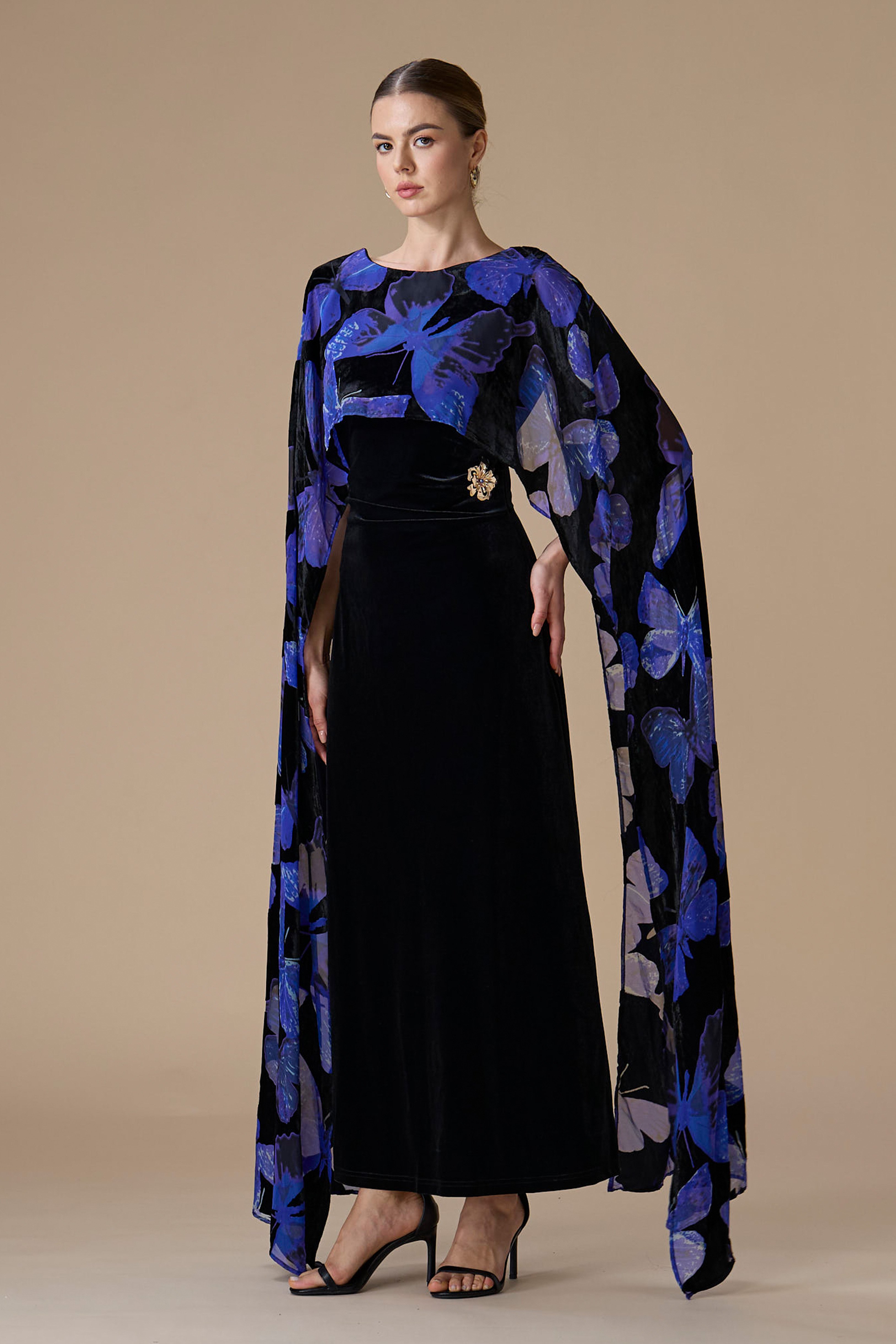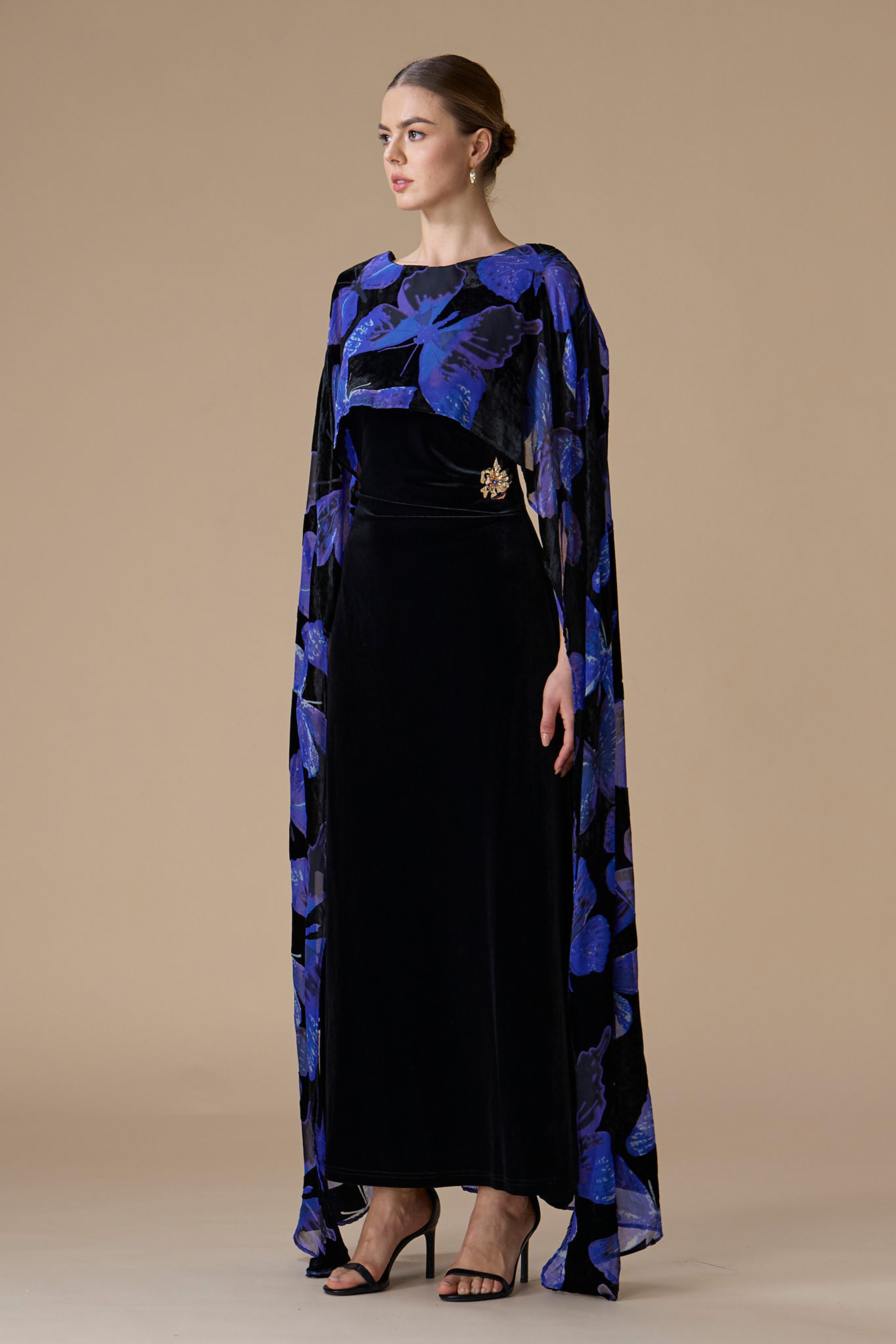 فستان طويل مخمل بنفسجي بكاب مع تفاصيل زهرية، بقصة مستقيمة وياقة دائرية بلا أكمام