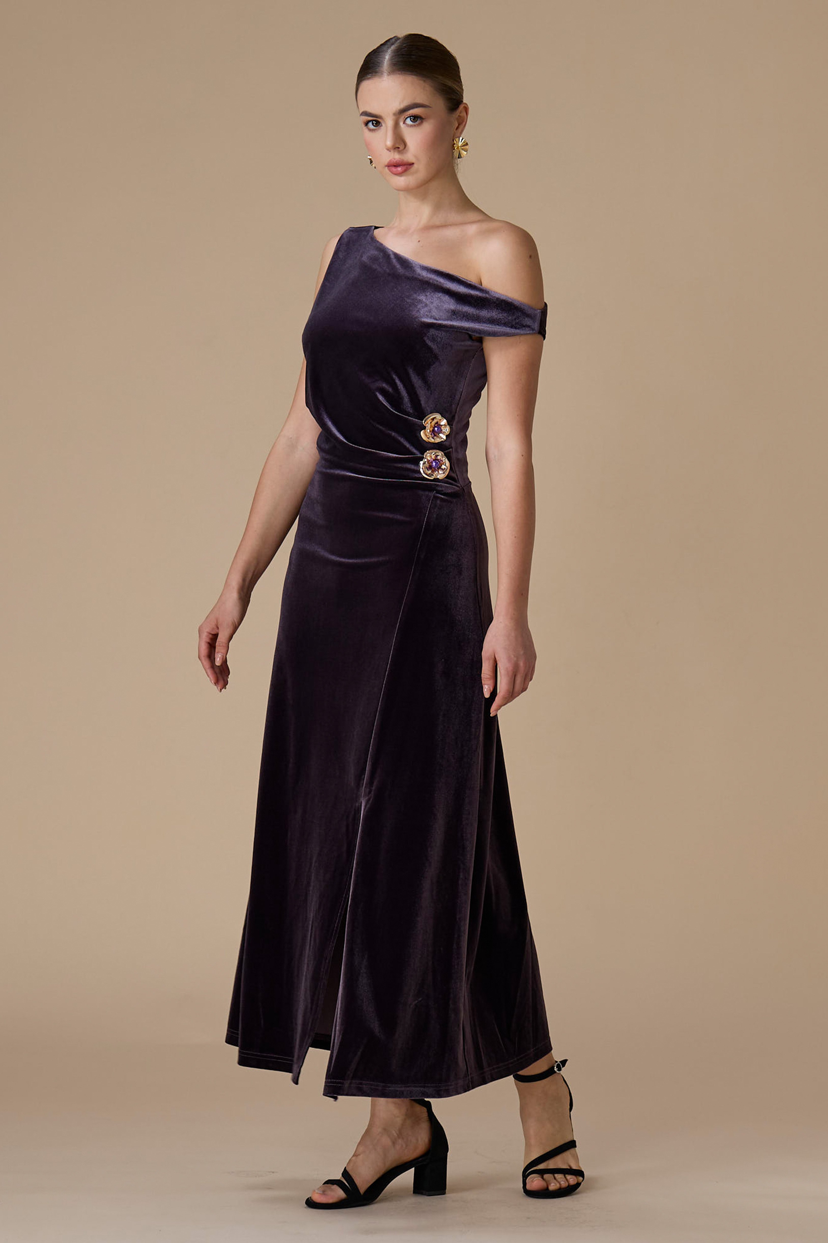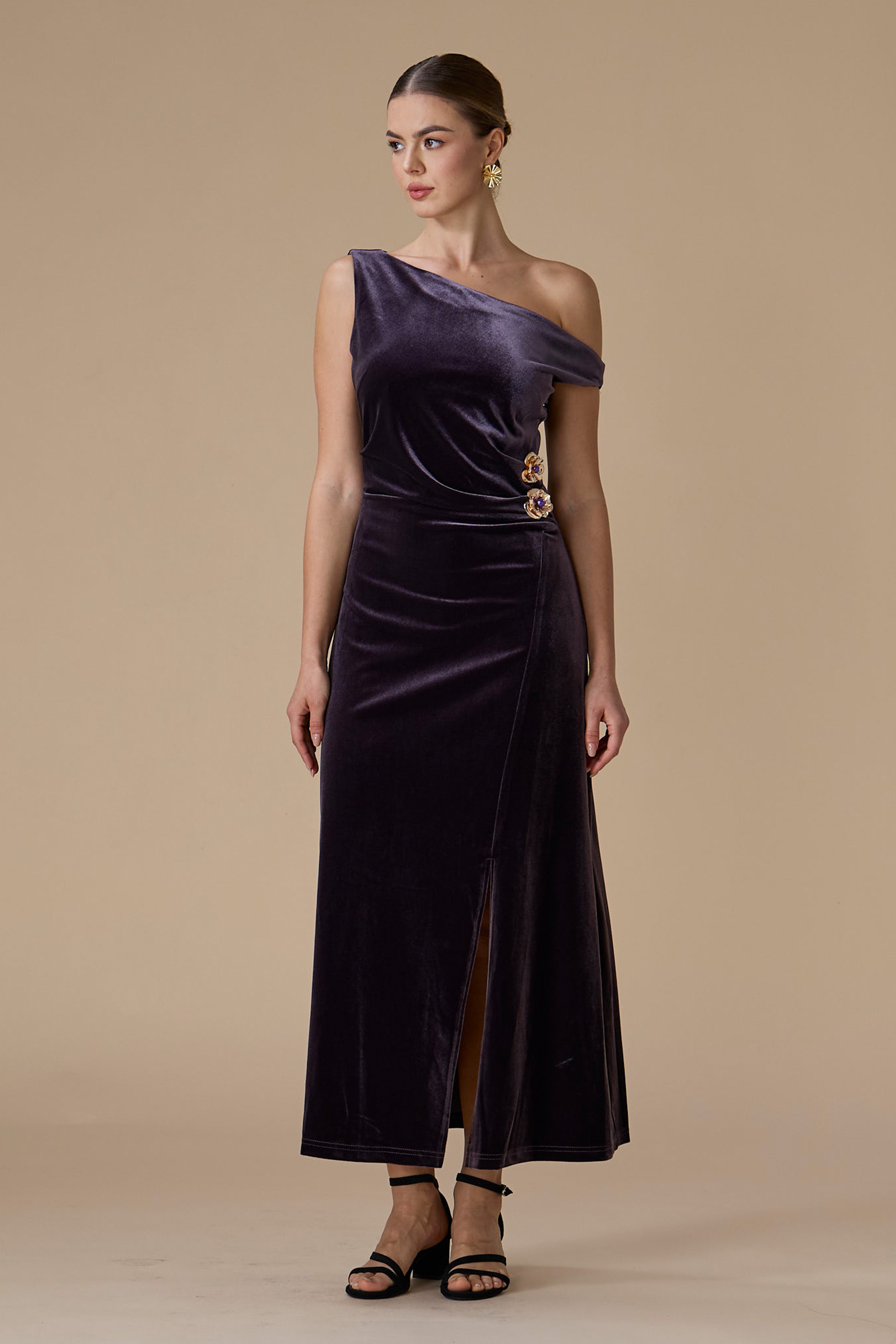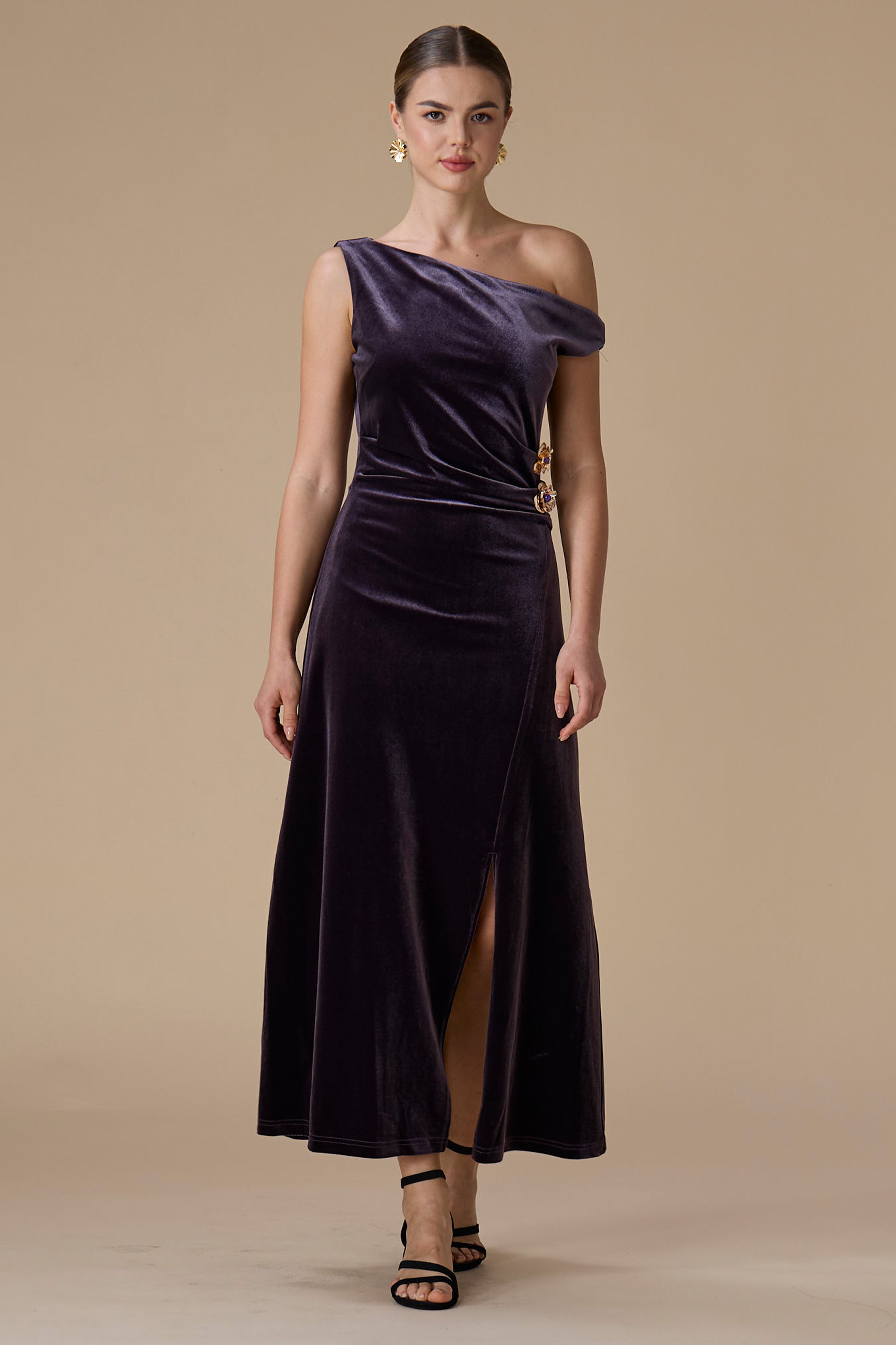 فستان ماكسي مخملي أنيق بدون أكمام بكتف واحد مزين بورد ميتاليك جانبي، بياقة غير متماثلة لإطلالة فاخرة