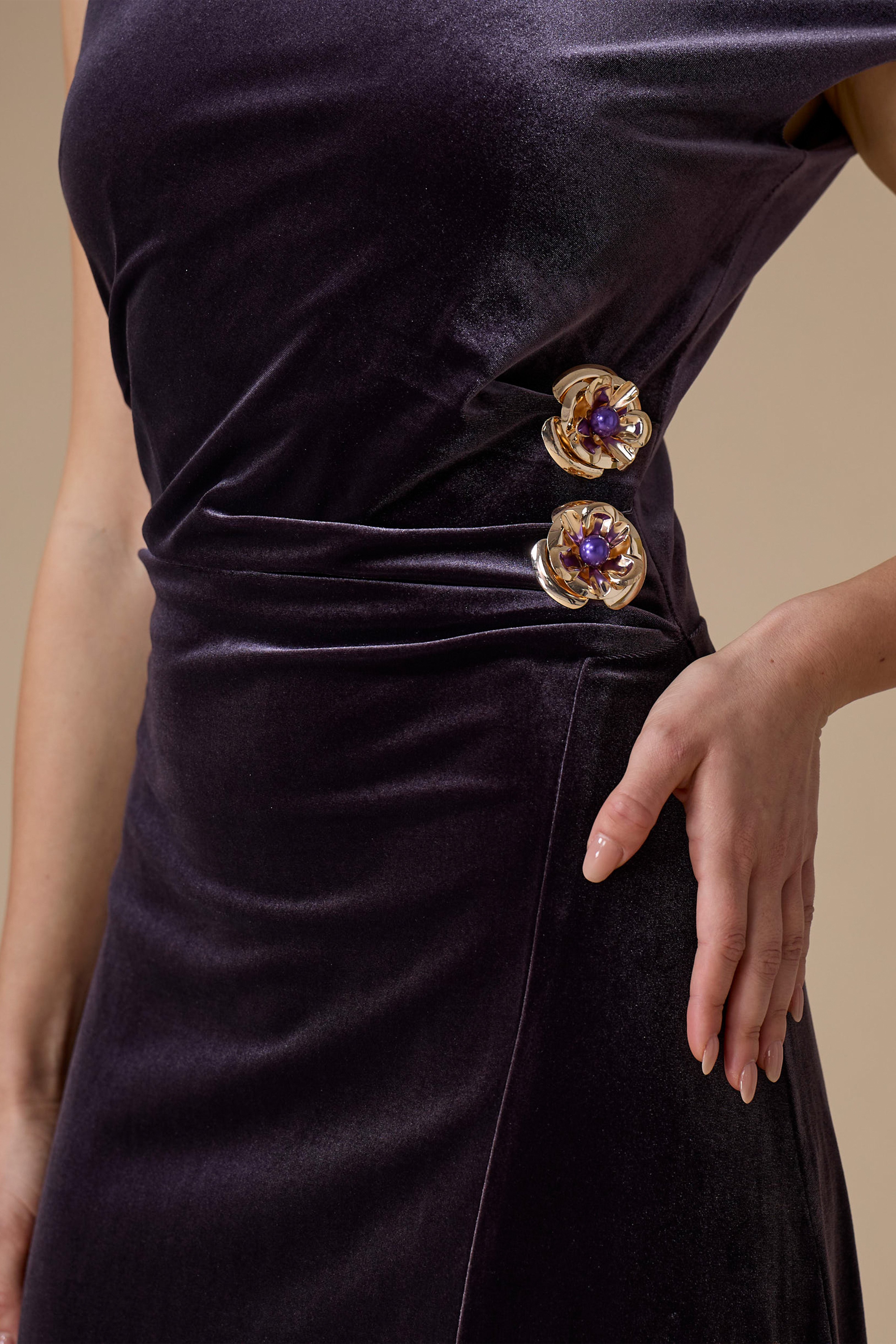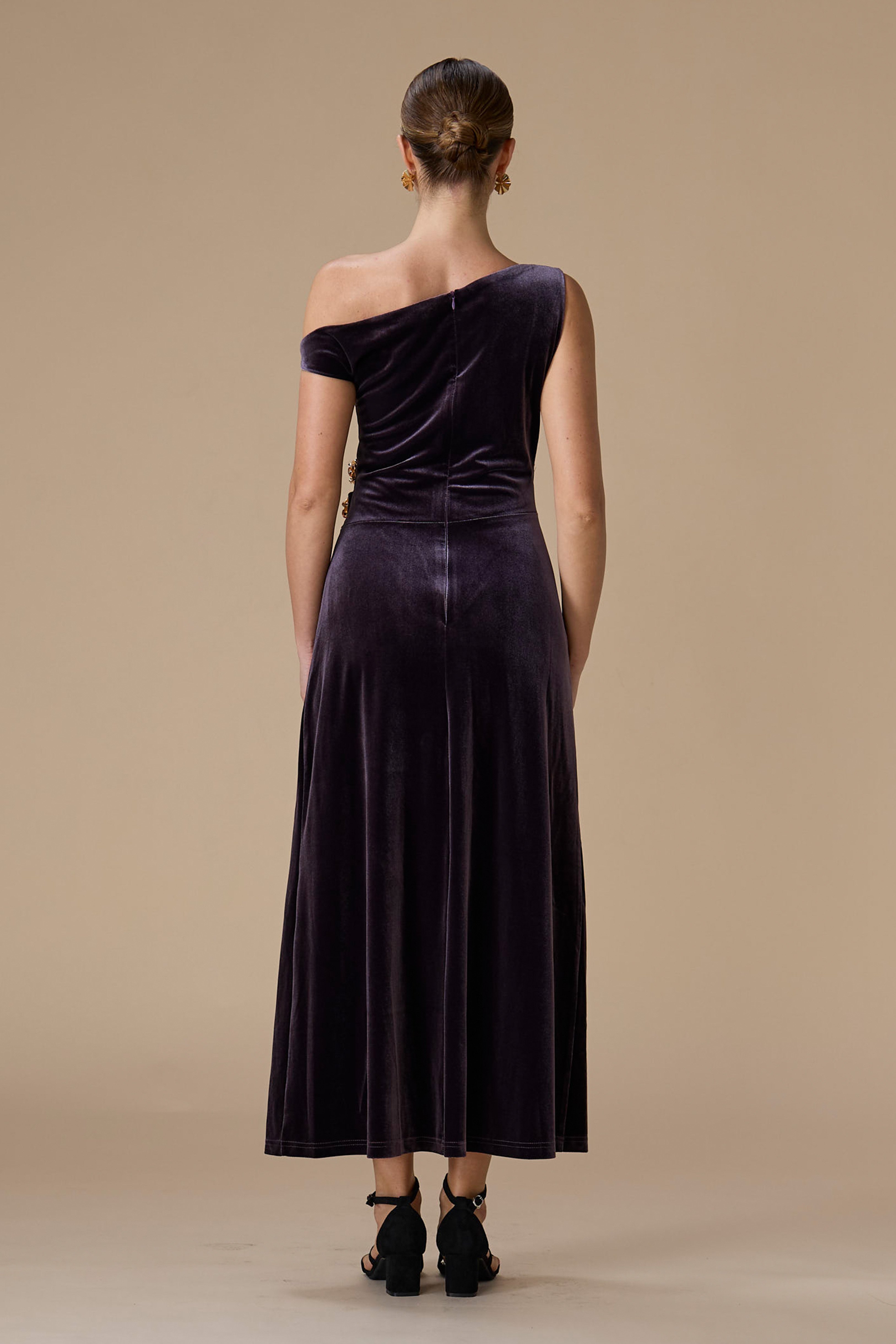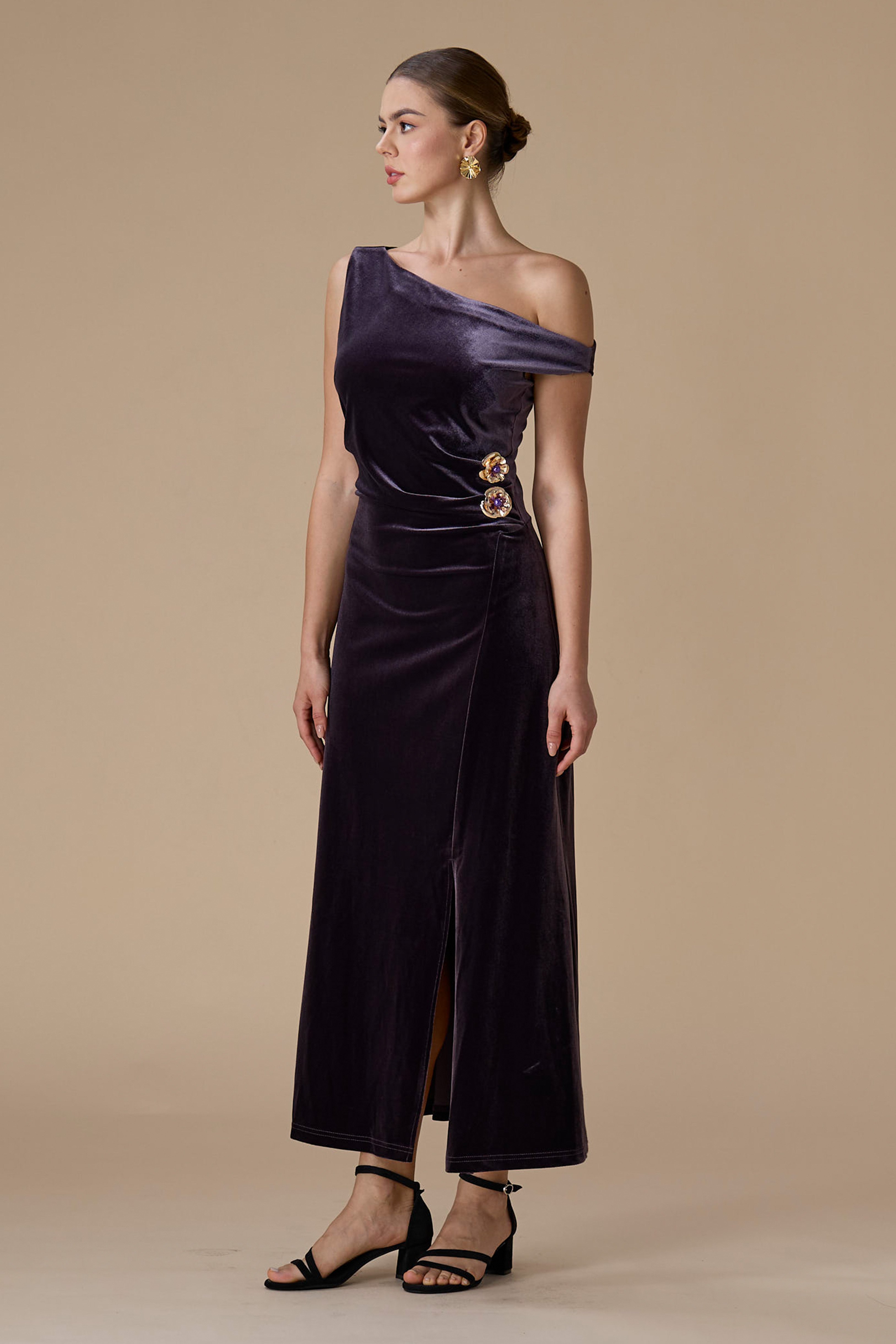فستان ماكسي مخملي أنيق بدون أكمام بكتف واحد مزين بورد ميتاليك جانبي، بياقة غير متماثلة لإطلالة فاخرة