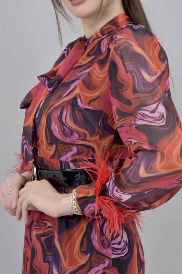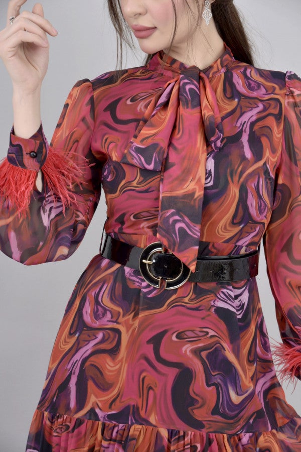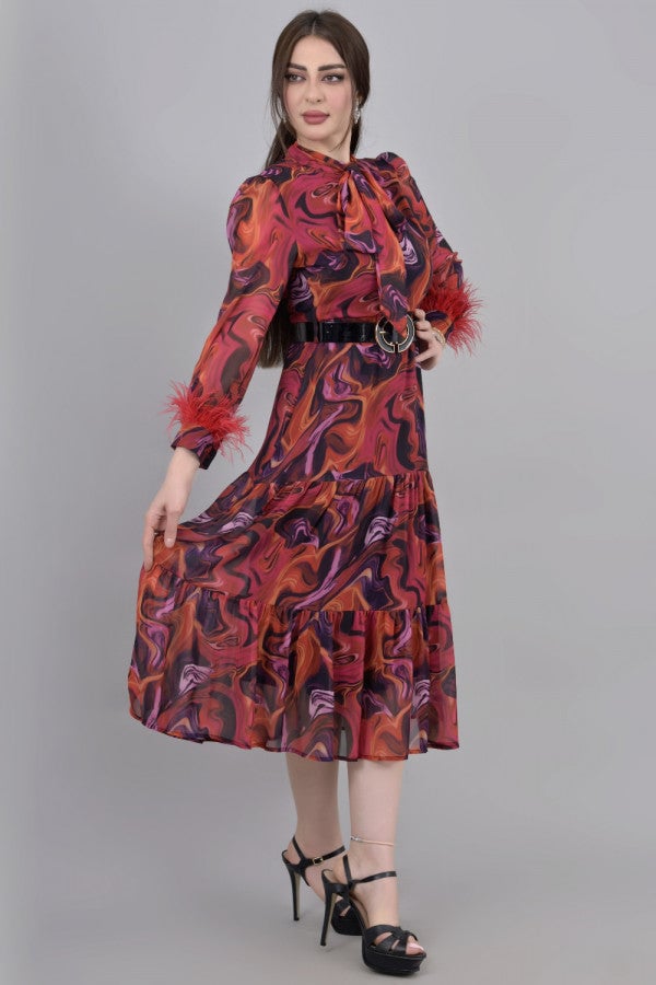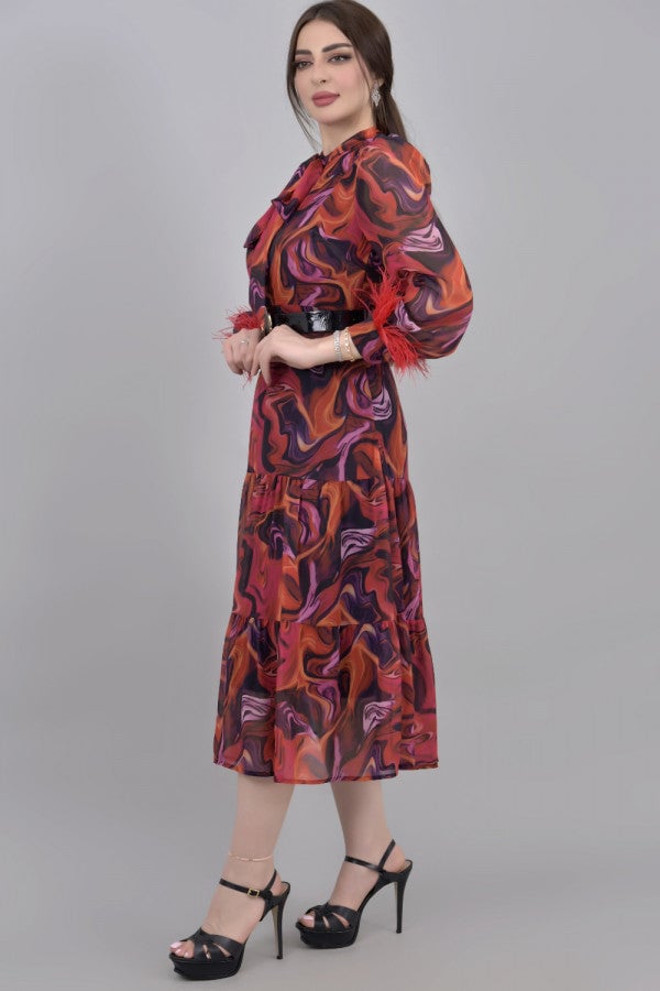 Material chiffon Design type Wavy chiffon dress with feathers Story type Midi dress with split design, belt at the waist, high neck with tie, and long sleeves decorated with feathers occasion General exit waist Tight time collar High in a turban sleeves Long hair stretching Non-stretchable Add-ons black leather belt Care instructions Wash and iron with steam at a low temperature of 40