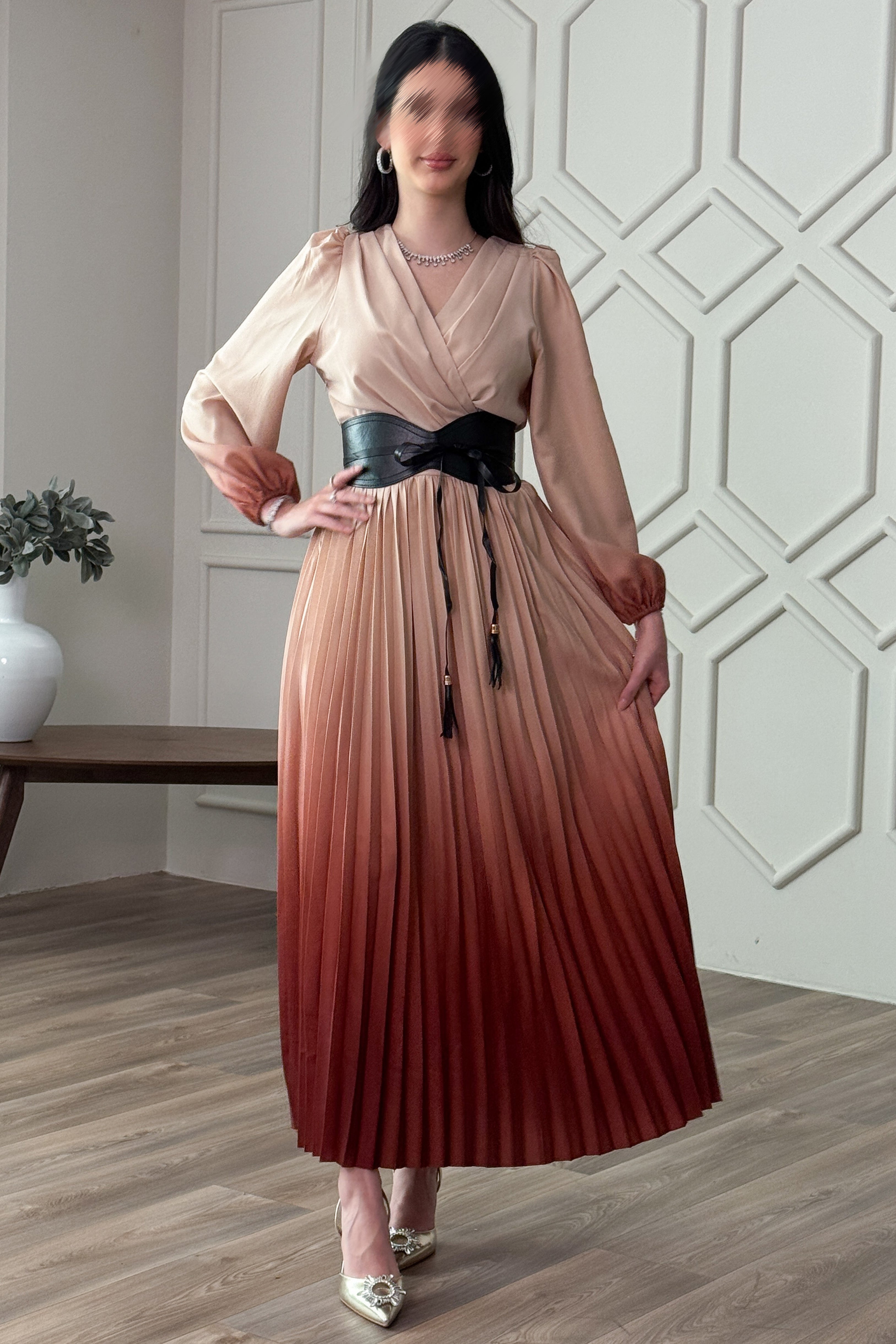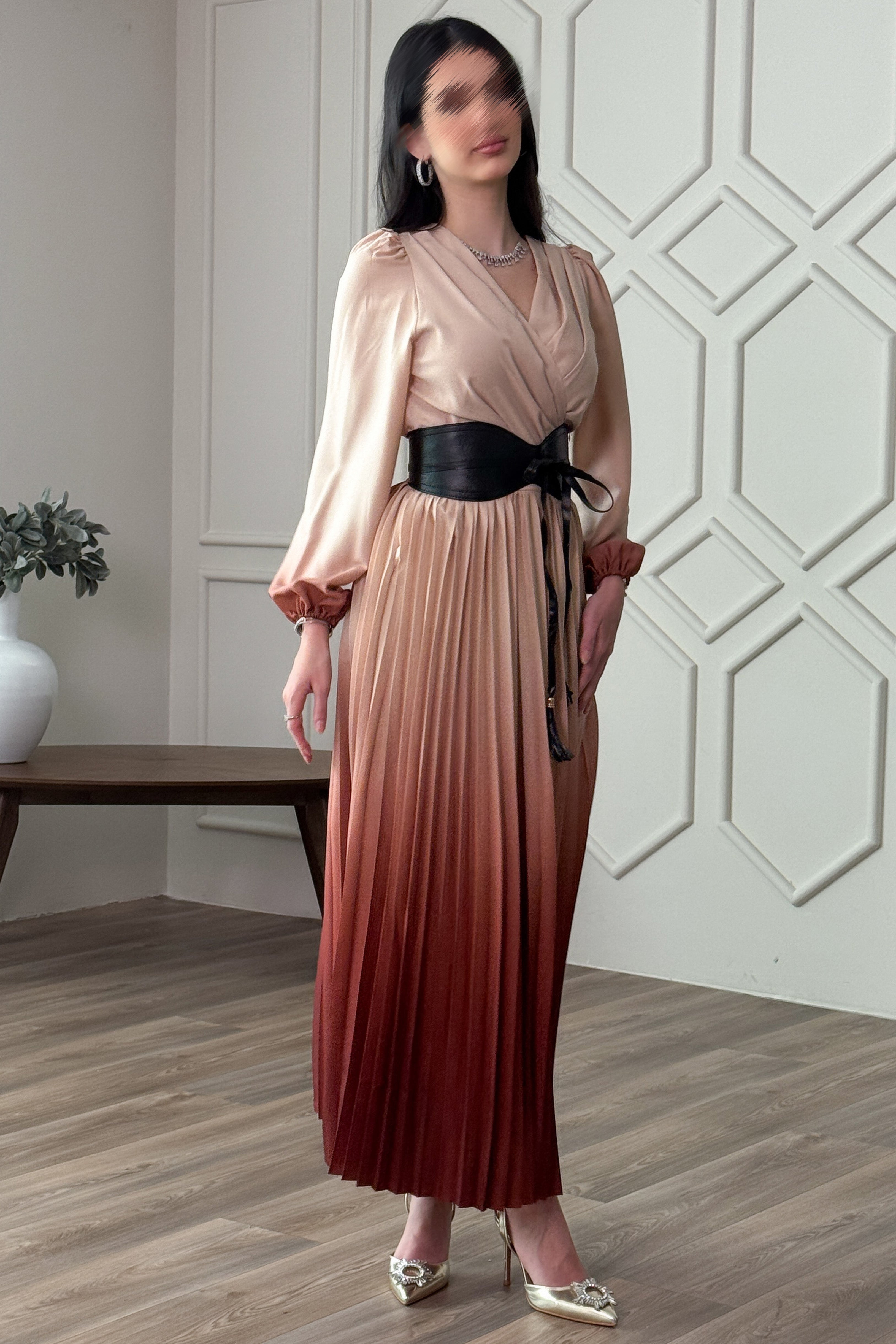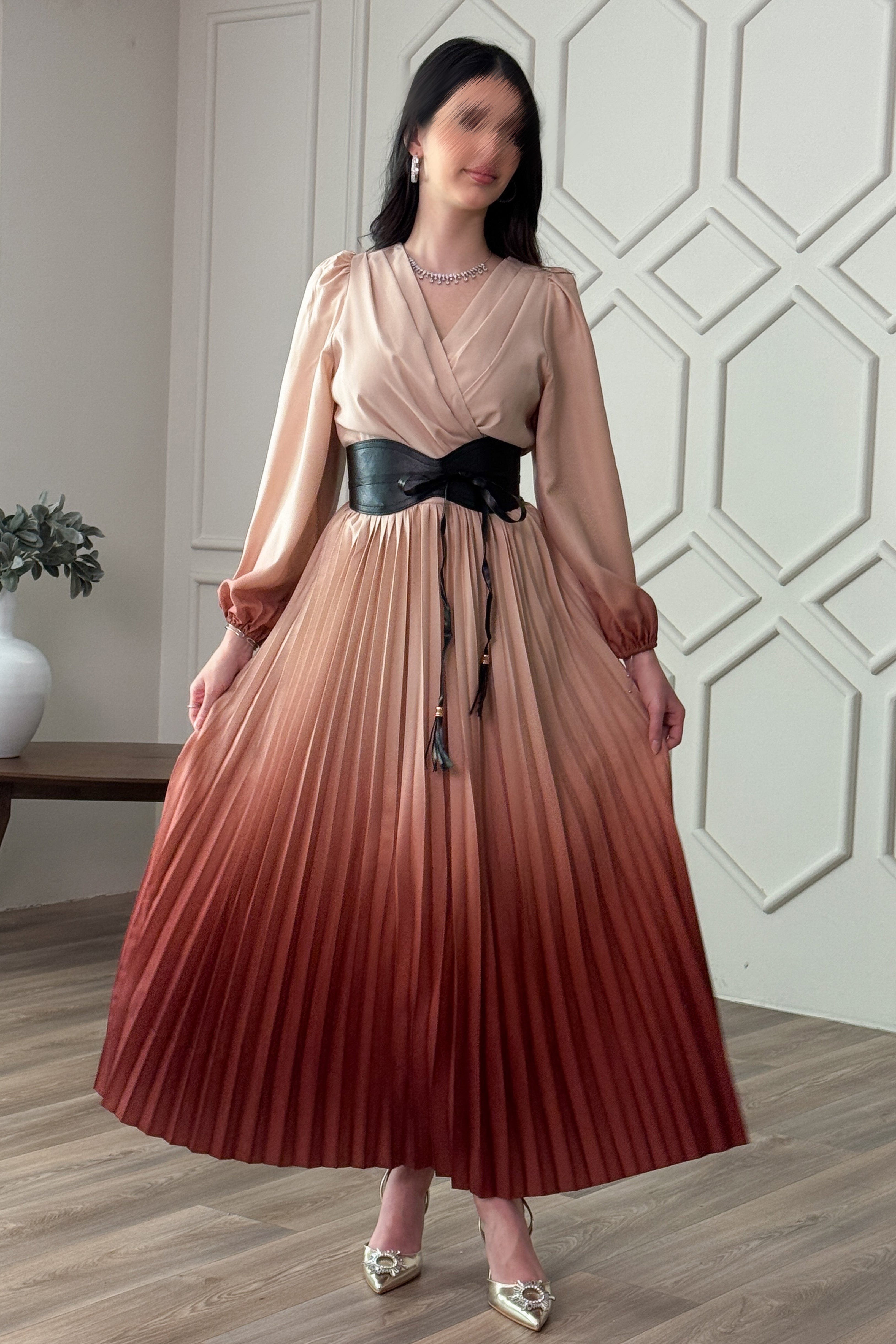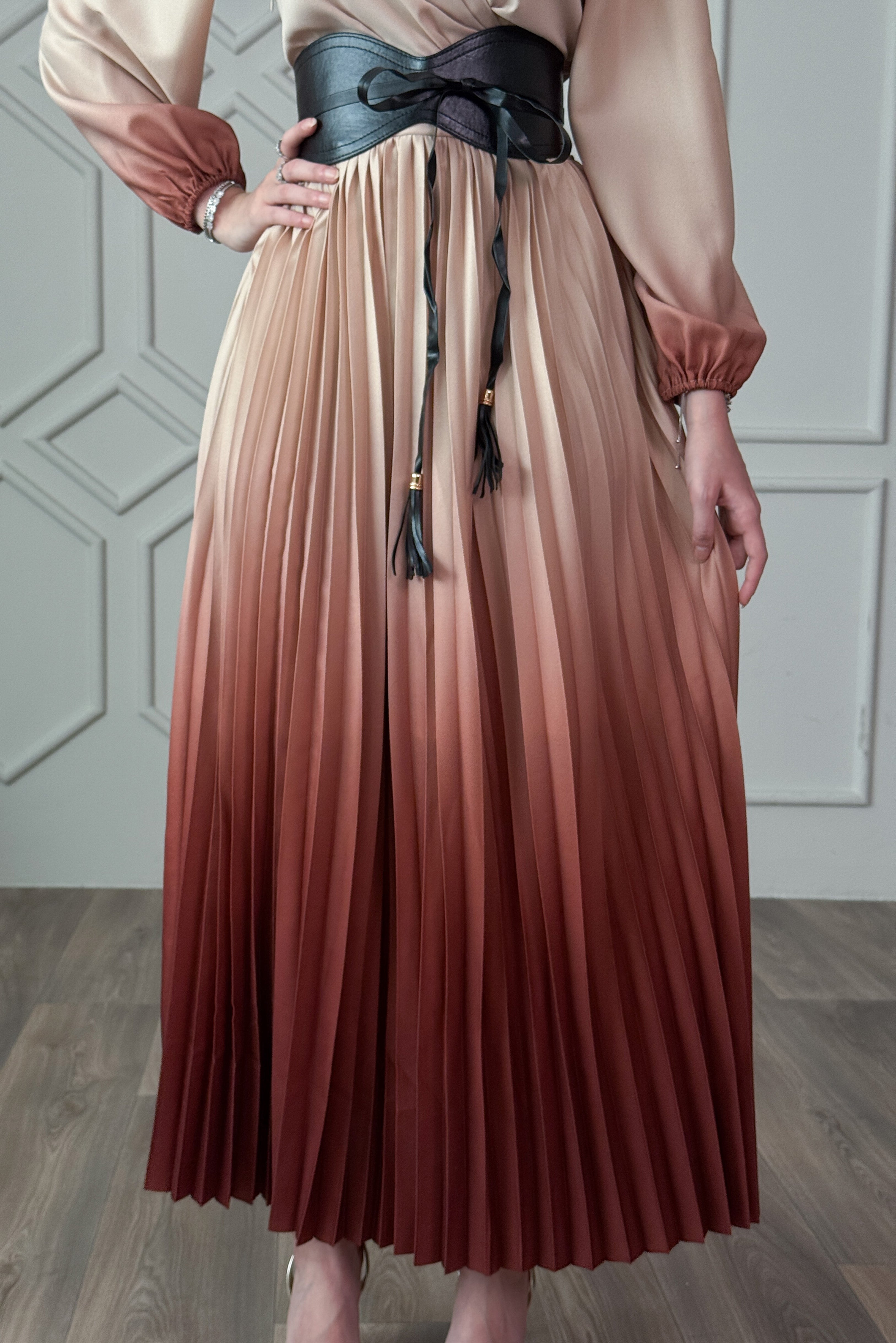 Wavy pleated dress with coffee belt