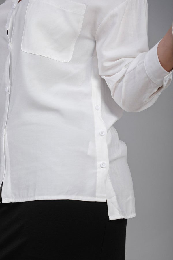Material polyester Design type Button-down shirt with side slits Story type Shirt with a folded collar, two-button placket, and external pockets with buttons on the sides. occasion Work exit waist wide collar Folded sleeves Confused stretching Non-stretchable Care instructions Wash and iron with steam at a low temperature of 40